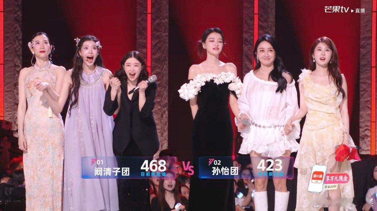 阚清子团复活晋级 第一轮队长复活赛: 阚清子团vs孙怡团 468 票vs423票,根据规则孙怡团有姐姐要暂别舞台,队长孙怡听到后掩面落泪。孙怡哭了浪姐一公直播