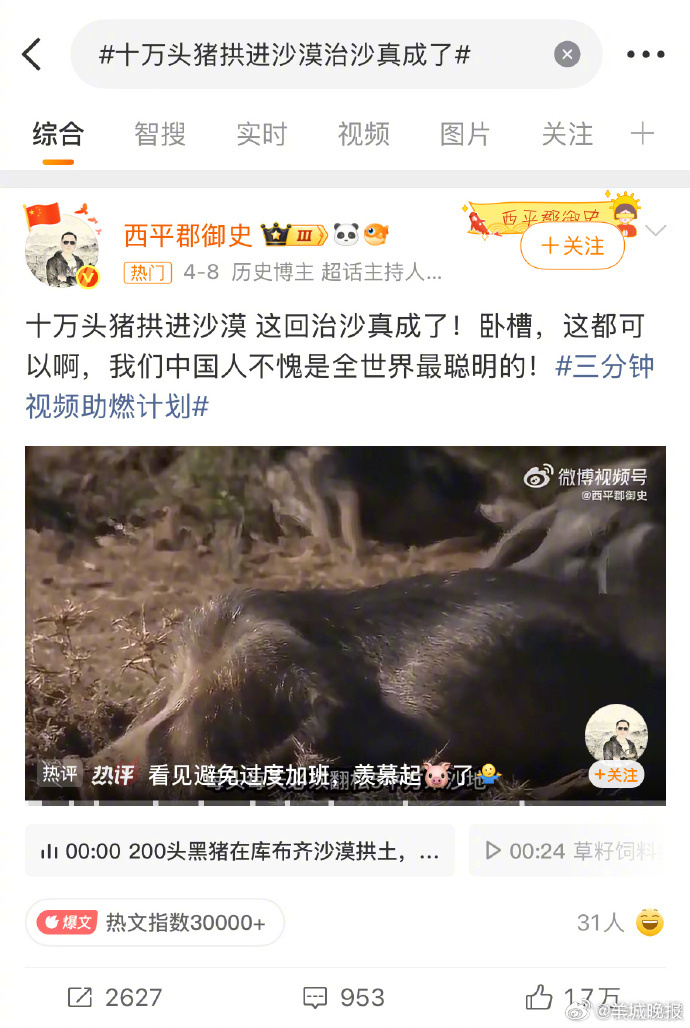 【#十万头猪拱地治沙不属实# 】“10万头猪正在内蒙古库布齐沙漠‘上班’,而且干得比人类还出色!”4月9日,一个名为“十万头猪拱进沙漠治沙真成了”的词条登上热搜,获得上千万阅读量。在这一话题之下,有不少帖子表示:将10万头猪赶进内蒙古库布奇沙漠,仅用30天就“拱”出了1800亩良田,称“这不是天方夜谭,而是实打实的成果”——猪拱地能把“铁板沙”戳碎,让雨水渗进地下,猪粪还能当肥料,把沉睡的草籽翻出来,发芽率比人工播种高多了。甚至,还有看起来颇为专业的分析。“第一,沙漠里的沙子经过风吹日晒,表面结着厚厚的硬壳。小黑猪的鼻子跟犁似的,拱一下就能翻起半米深的沙,把硬壳全捣碎,是翻土神器。第二,猪拱沙的时候,吃入但没消化完的草籽,会跟着猪粪一起埋进沙里,等于是免费的自带播种机。第三,猪粪尿混着沙子,经微生物发酵,变成了肥沃的营养土,是移动肥料厂。”有帖子称,此治沙方式源于2013年内蒙古农牧科学院某位研究员的偶然发现。因此,潮新闻记者联系了内蒙古农牧业科学院,相关工作人员向记者表示,并不了解此事。库布齐沙漠是中国第七大沙漠,位于内蒙古自治区鄂尔多斯市北部。4月10日上午,潮新闻记者又联系了鄂尔多斯市林业和草原局,宣教科的一位工作人员告诉记者:“这个是不属实的,我们去年已经(上报)让发布者删除了。”她告诉记者,去年他们发现这个新闻后曾上报当地林草局和网信办,不过没有追踪最后是否有被删除。该名工作人员表示,目前并没有使用猪拱地的治沙方式。“没有那么多头猪,就是说当地居民家里面人种点经济林,有时候个别猪会进去溜达,其实这就是日常的操作,也没有什么科学性,和沙漠治理一点关系都没有。”潮新闻记者检索发现,在外网社交平台,也有不少此话题的相关视频,发布时间有近几天的,也有数月前的,有的视频播放量已超20万。此外,记者还联系了鄂尔多斯市三北工程推进中心,一名工作人员表示,自己之前没听说过猪拱地治沙的事情,“不了解,这是我第一次听说”。他告诉记者,自己和身边的同事都在从事治沙工作,但没有在工作中应用过这种经验。“也许这也是一种方式,但没有这么大规模的经验,至少我们没这么用过。”“就现在我们治沙的情况来说,更多的还是在传统人力的基础上,依靠科技,像无人机、机器人等等。”这名工作人员表示。(潮新闻)(编辑:郑宗敏;审签:谢杨柳)