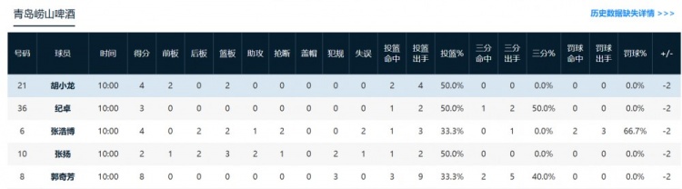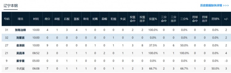 辽宁:俞泽辰9分1抢断、李虎翼7分1篮板1助攻。
