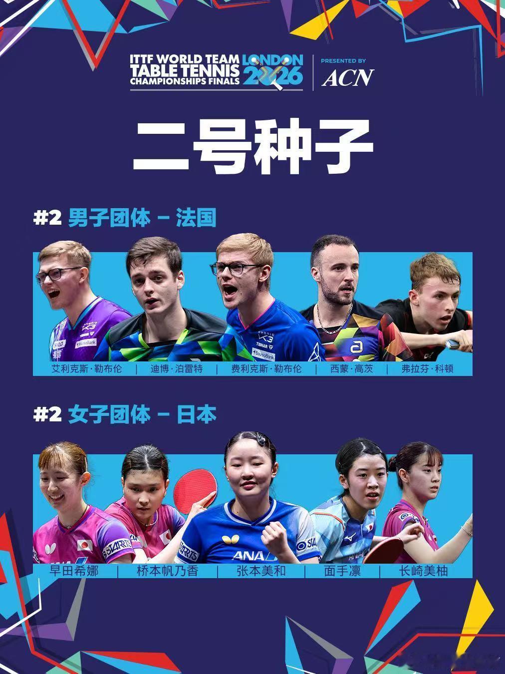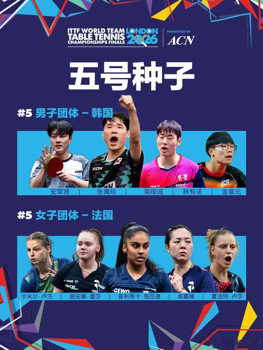 2026伦敦世乒赛 男女团体1-5号种子队名单,中国双双第一。图片来自WTT世界乒联。中国乒乓球梦之队
