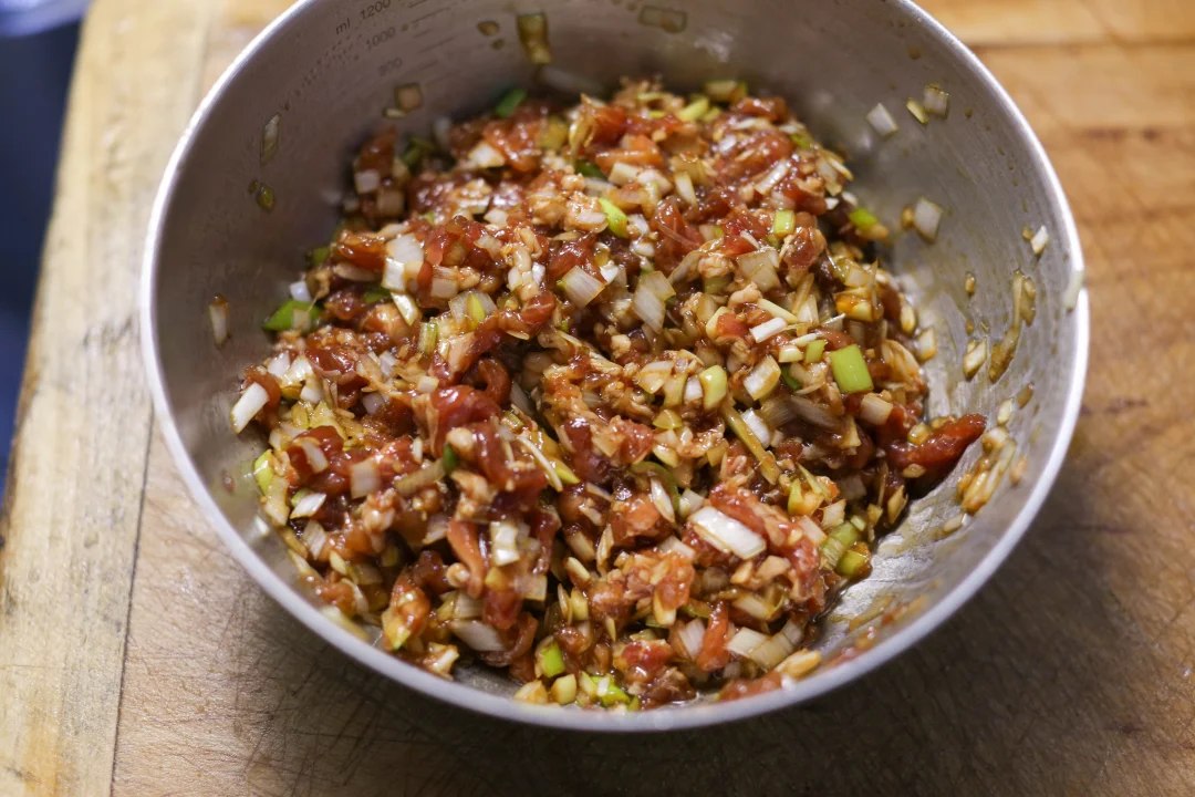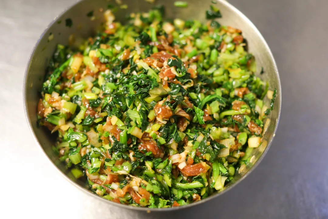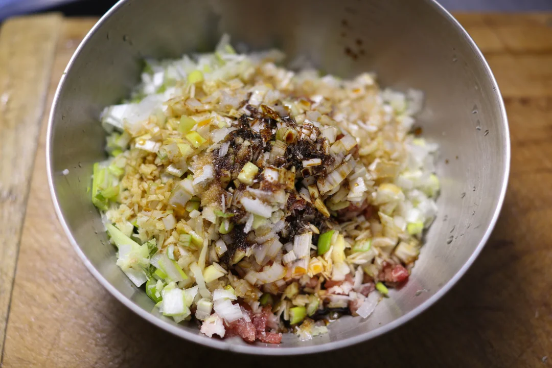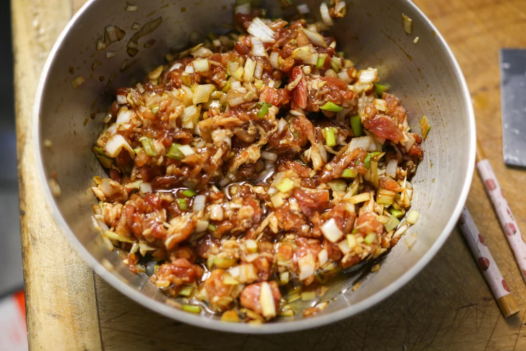 五花肉或者梅花肉切丁,大葱一整根,切成葱花,少许姜末,放入食盐、味精、味达美、老抽、香油少许,加入葱姜油,顺着一个方向搅拌均匀,加入苔菜碎和粉条,拌匀。