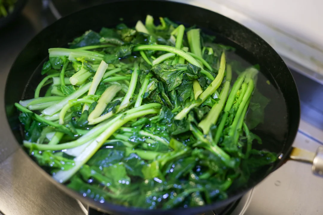 烧一锅热水,把清洗好的苔菜放入,滚开之后即可捞出,过凉水,切成颗粒状,挤干水分。