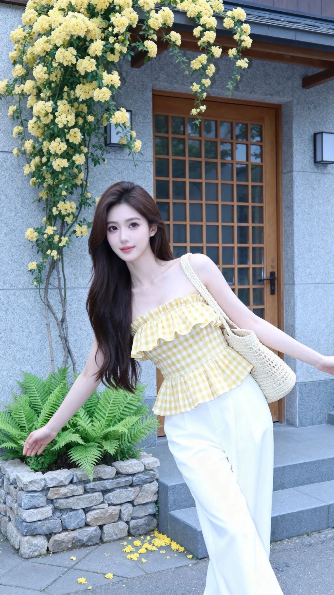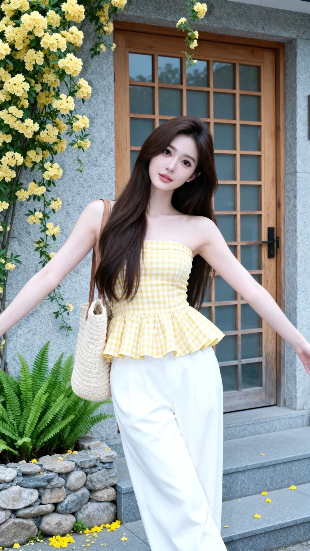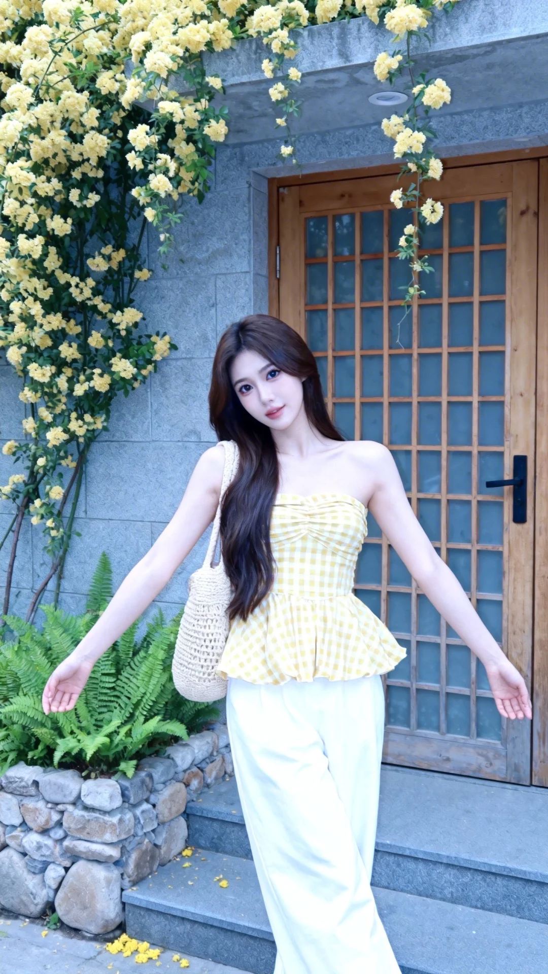 日常快照高质量网红人像,半身照,冷白皮,皮肤白净光滑,脸型精致鼻梁高挺,发丝清晰可见,浓颜系美女,轻甜御姐,深色瞳孔,表情灵动,得意,看着镜头,idol感,韩系风格少女,高颜值少女,深棕色极长发,高颅顶,头包脸,头发显得松弛。身穿黄白格纹抹胸荷叶边上衣+白色阔腿长裤,单肩背米色编织草编包,姿态放松舒展。日式简约灰色石质建筑门前,木质格纹玻璃双开门,门旁爬满盛开的明黄色藤蔓花卉(木香花),下方搭配绿色蕨类植物,石砌花坛与灰色石阶,地面散落少量黄色花瓣。清新治愈系日系写真,自然光柔和明亮,氛围慵懒温柔,生活化文艺感,绝美双眼,眼神慵懒且松弛却不失妩媚感,有着清晰下颌线,狭长眼,清新脱俗,极具女性魅力,冷色调、低饱和度,些微过曝,超低分辨率,网红构图且姿势率性随意。独树一帜的绝美外貌。构图有张力
