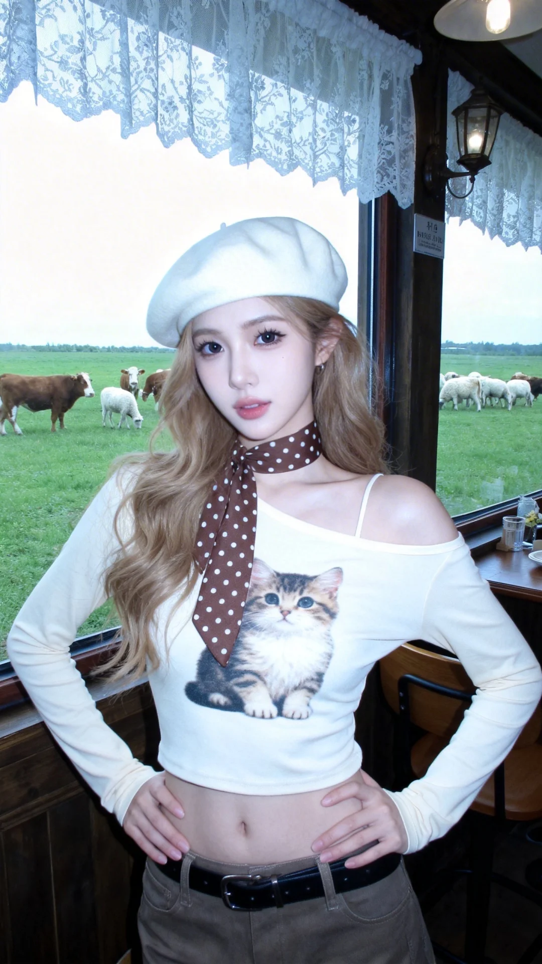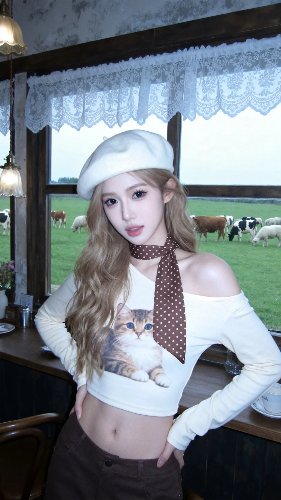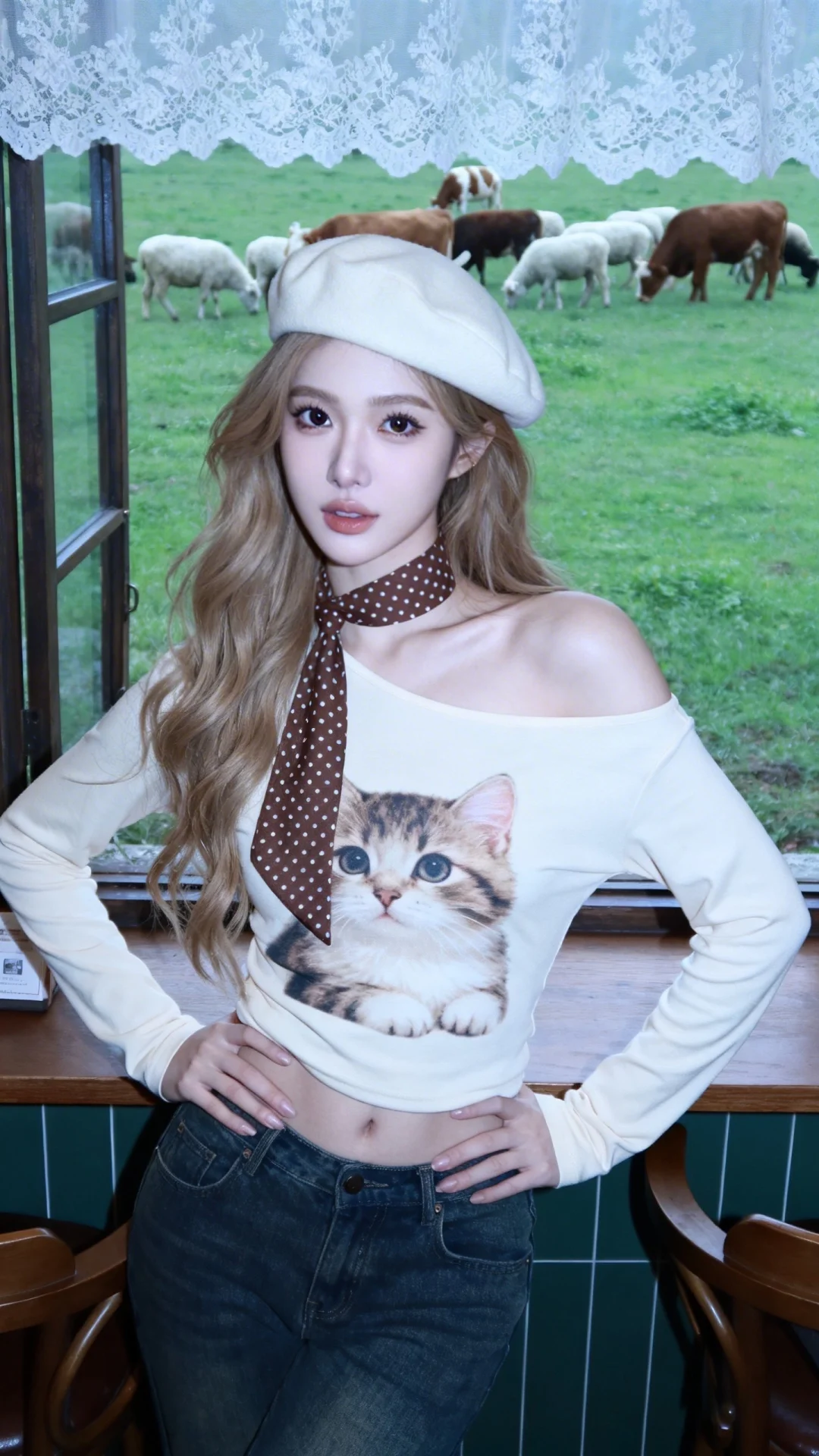 日常快照高质量网红人像,半身照,冷白皮,皮肤白净光滑,脸型精致鼻梁高挺,发丝清晰可见,浓颜系美女,轻甜御姐,深色瞳孔,表情灵动,得意,看着镜头,idol感,韩系风格少女,高颜值少女,浅金棕色长卷发,高颅顶,瓷白肌肤,头包脸,头发显得松弛。米白色斜肩猫咪印花长袖T恤,米白色贝雷帽,棕色波点丝巾,双手叉腰,站在复古咖啡馆窗边,蕾丝窗帘,窗外碧绿色草地,一群花牛和羊,慵懒松弛,美式复古风,绝美双眼,眼神慵懒且松弛却不失妩媚感,有着清晰下颌线,狭长眼,清新脱俗,极具女性魅力,冷色调、低饱和度,些微过曝,超低分辨率,网红构图且姿势率性随意。独树一帜的绝美外貌。构图有张力