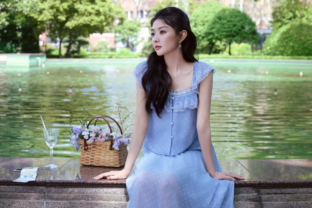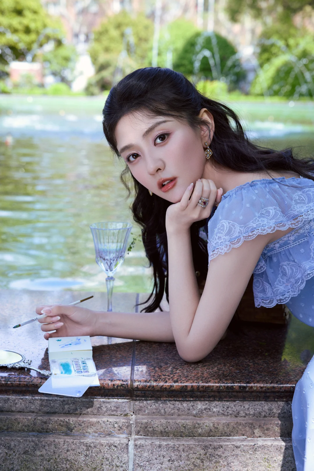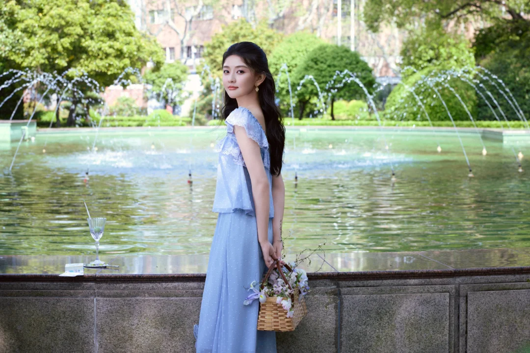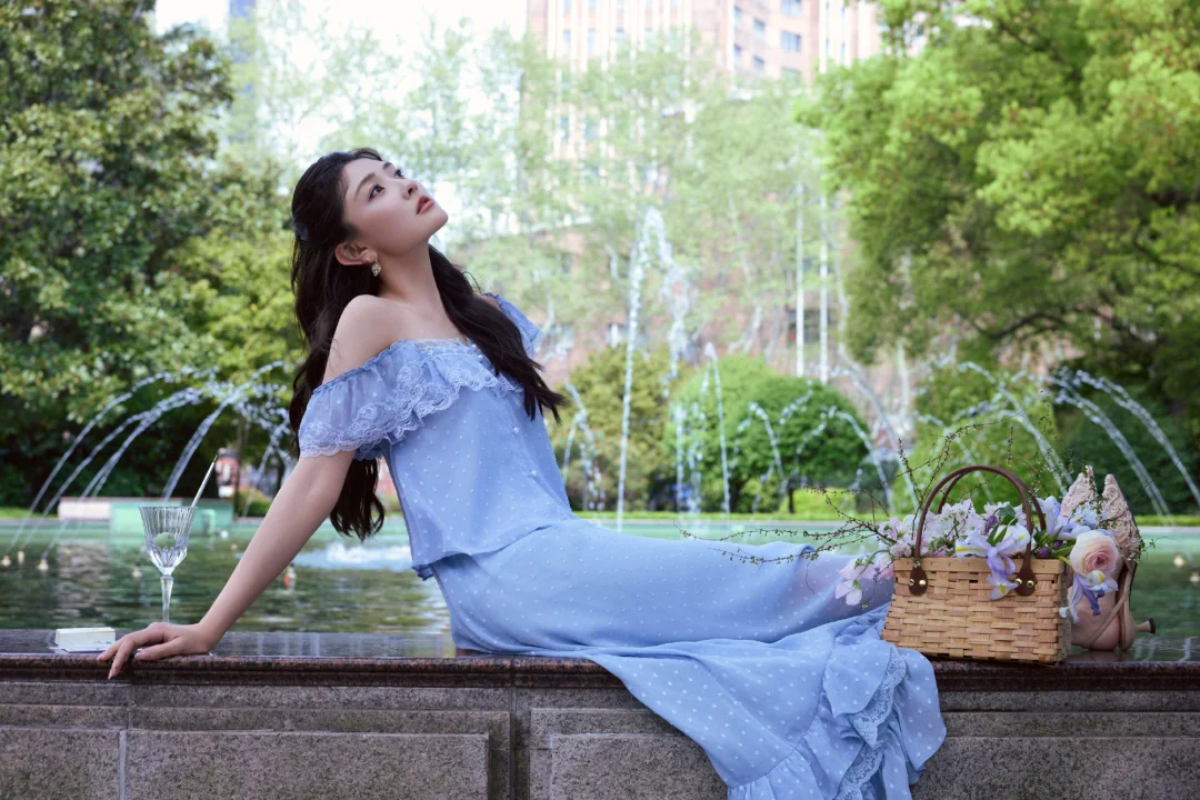 这里也给大家整理了一些春日拍照灵感:林间树下、湖边水岸都是很好的取景地,这组照片是在上海的花园饭店拍摄,里面的喷泉现在也是众多明星拍照的取景地。穿搭上可以选择纯色清新裙装,自带温柔文艺感,像照片中的这种蓝紫色也容易显白。动作上可以像梁洁那样拿起画笔、画册这类小道具弱化镜头拘谨感,低头作画、侧身凝望,让画面更有文艺风。拍照角度这组照片中仰拍、俯拍、远景、长焦拉特写都有,丰富的拍照角度也很值得大家借鉴。