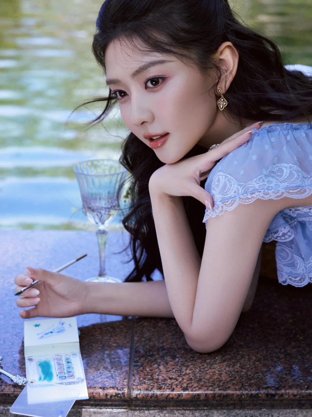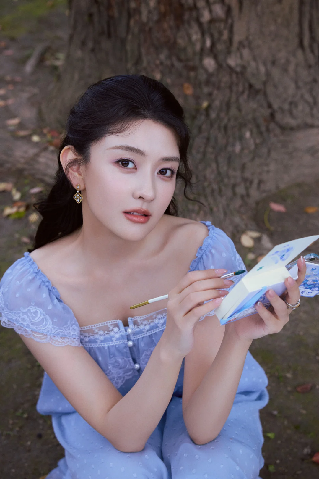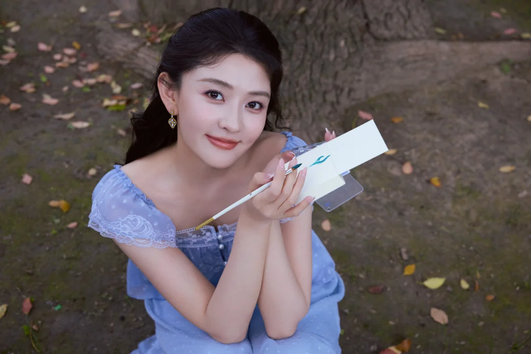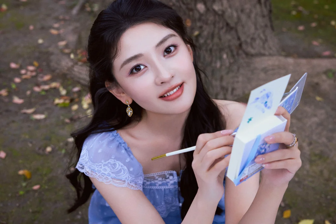 这里也给大家整理了一些春日拍照灵感:林间树下、湖边水岸都是很好的取景地,这组照片是在上海的花园饭店拍摄,里面的喷泉现在也是众多明星拍照的取景地。穿搭上可以选择纯色清新裙装,自带温柔文艺感,像照片中的这种蓝紫色也容易显白。动作上可以像梁洁那样拿起画笔、画册这类小道具弱化镜头拘谨感,低头作画、侧身凝望,让画面更有文艺风。拍照角度这组照片中仰拍、俯拍、远景、长焦拉特写都有,丰富的拍照角度也很值得大家借鉴。
