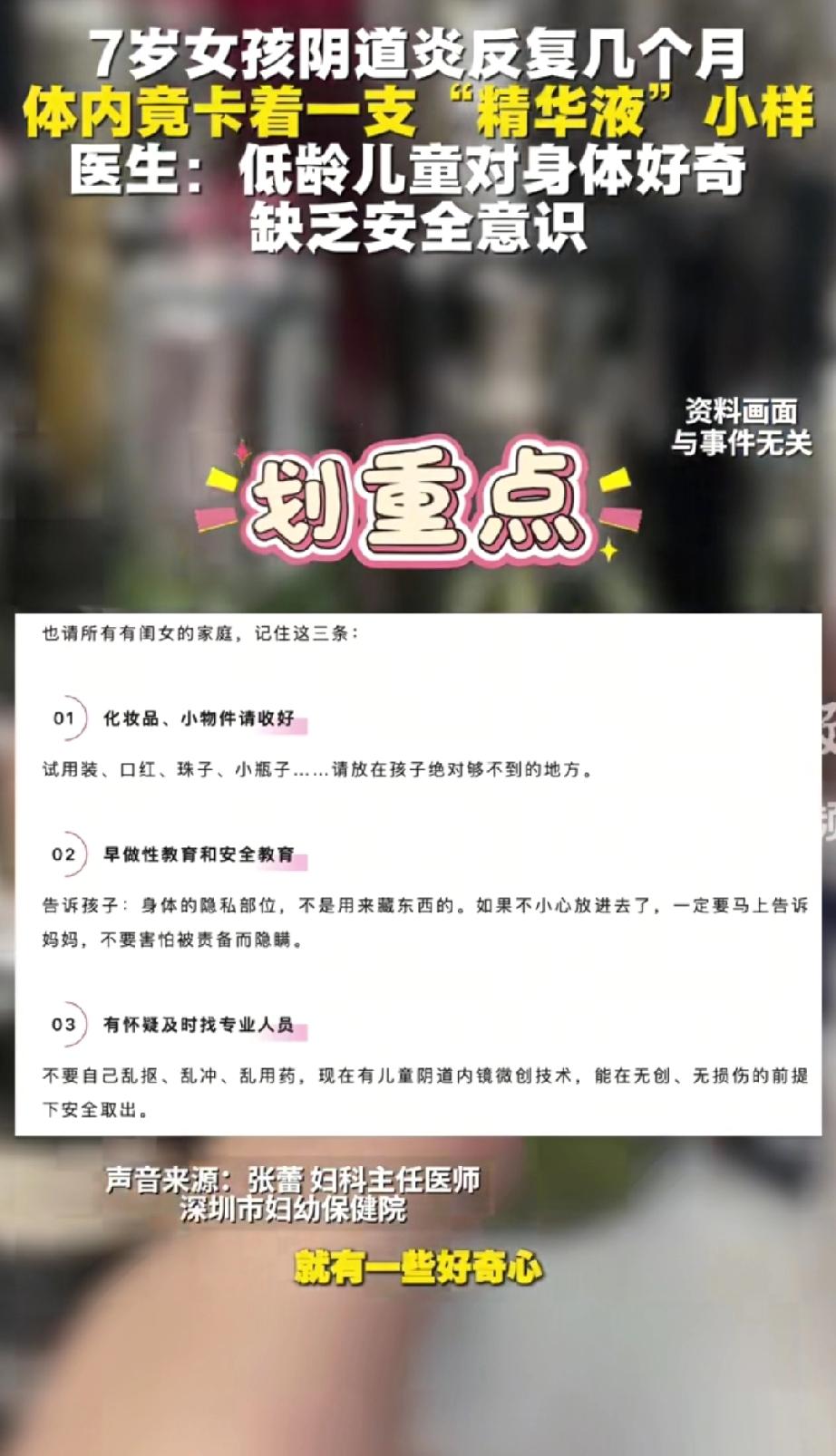 这个7岁女孩是幸运的。精华液取出来了,身体恢复了。但还有多少孩子,正默默忍受着同样的痛苦,却因为害怕、因为家长没往那方面想,一直没被发现?