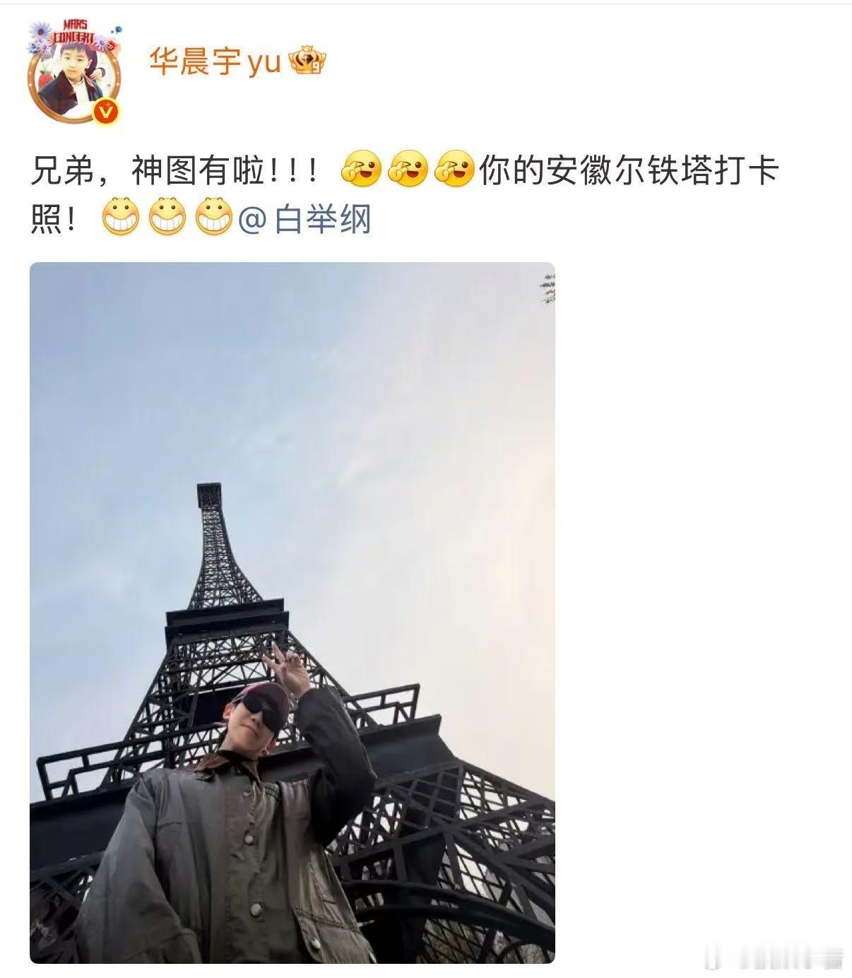 华晨宇帮白举纲打卡安徽尔铁塔 一张神图让白举纲火速追加全身长腿订单,花大师的摄影业务已开启私人订制模式。十多年老友的默契全藏在构图里,啥时候给自己也拍一组?安徽尔铁塔还等着你的帅照呢。