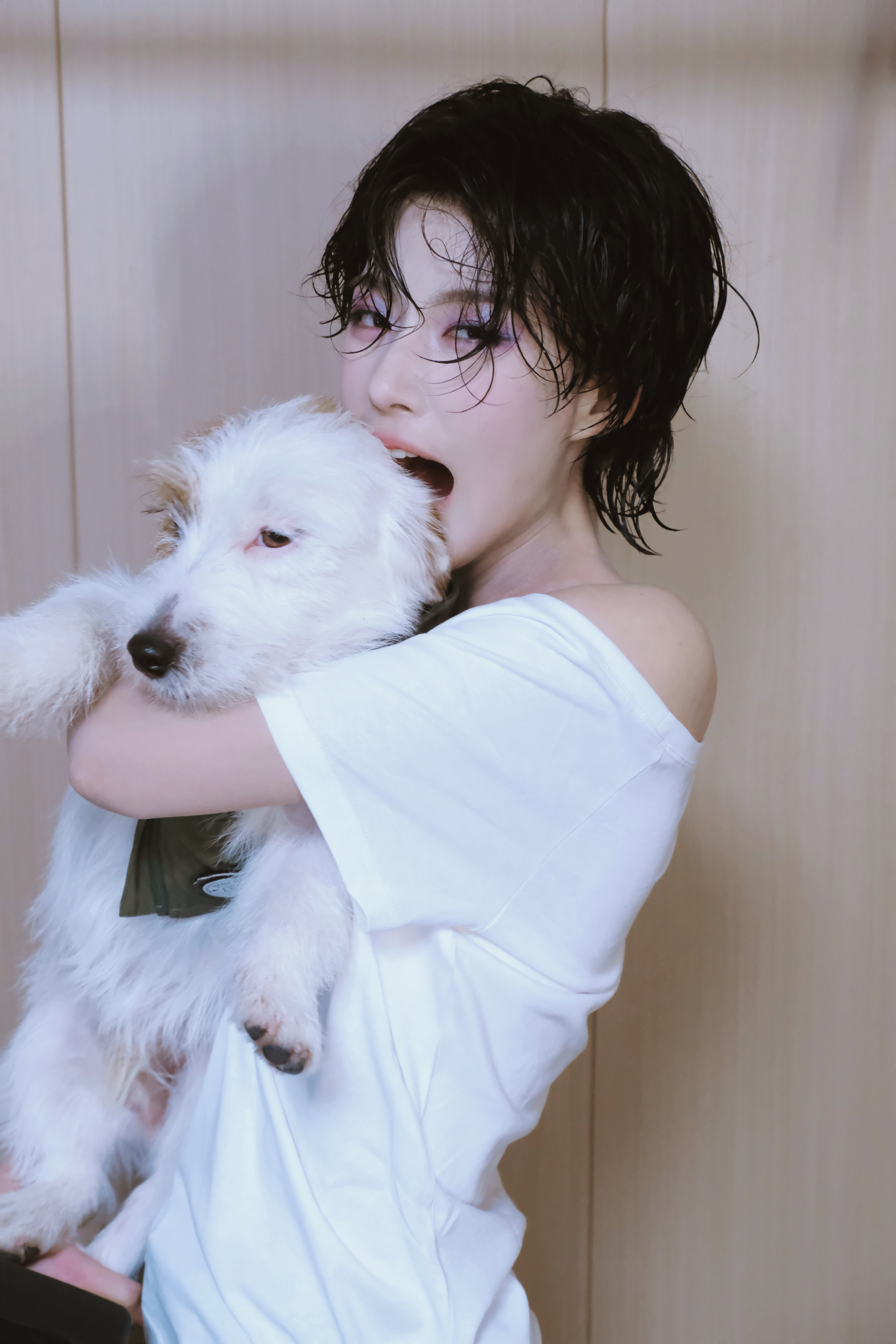 灰调挂脖套装,长发灵动眼神清冷——卢昱晓。每日明星美图分享