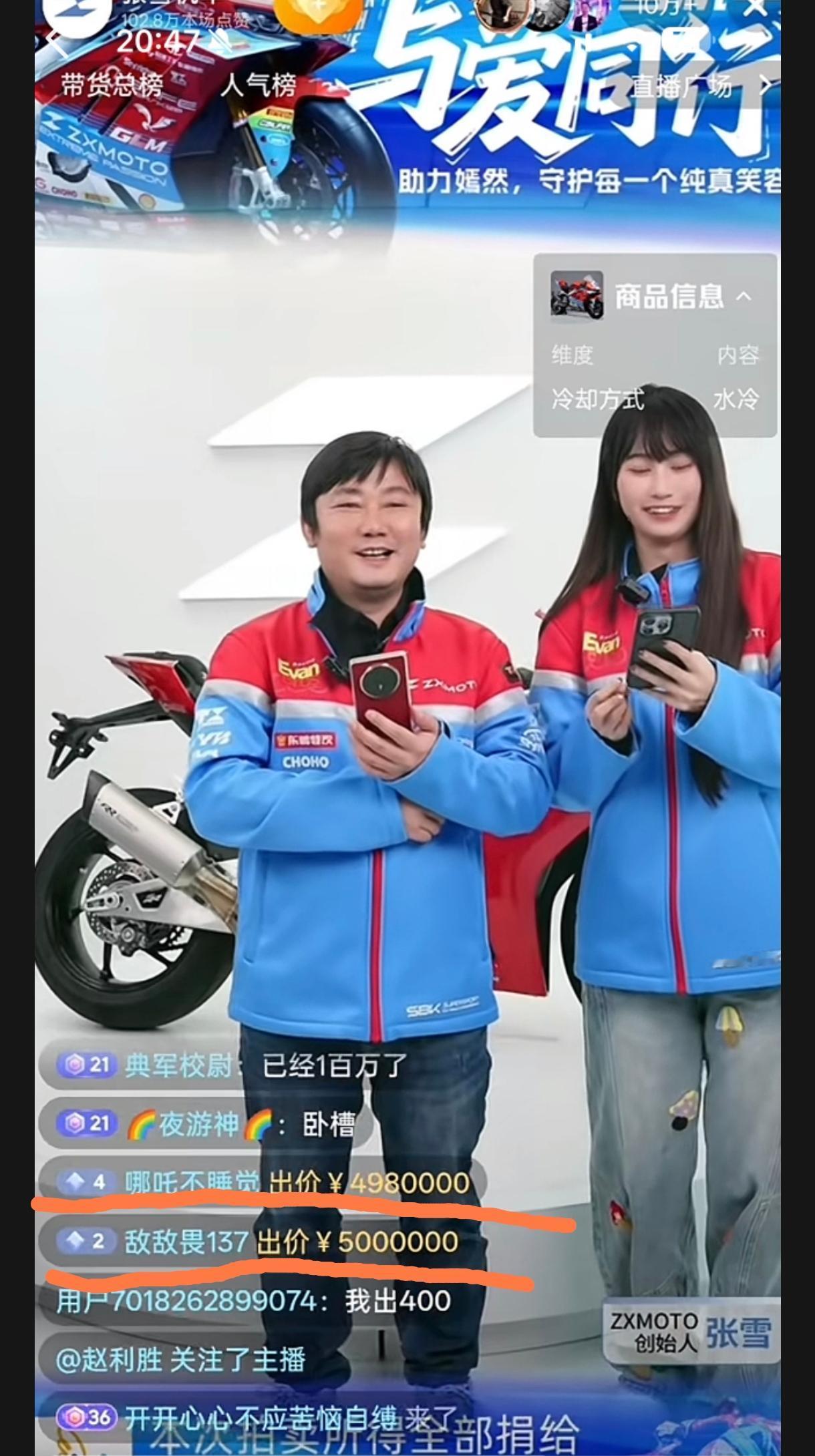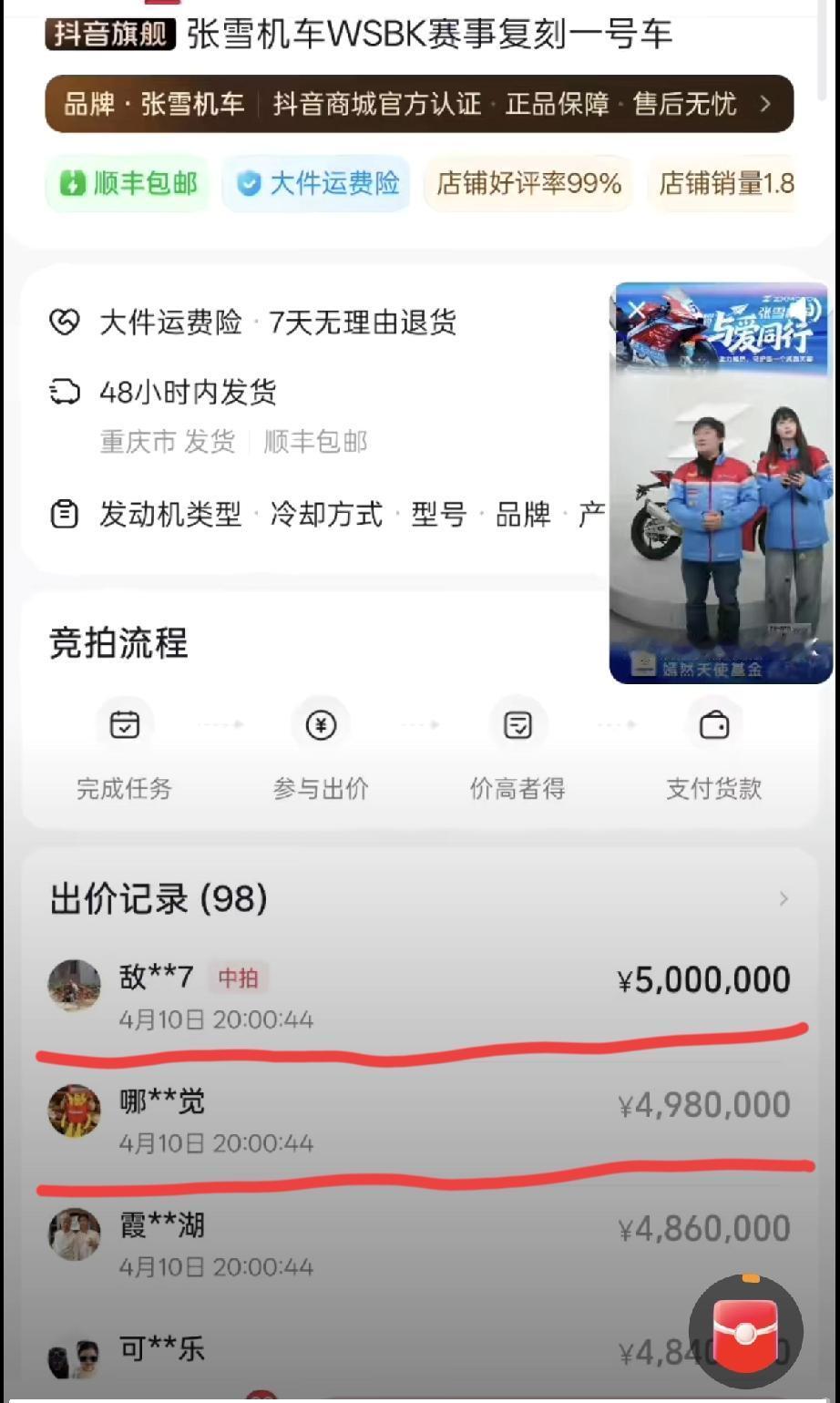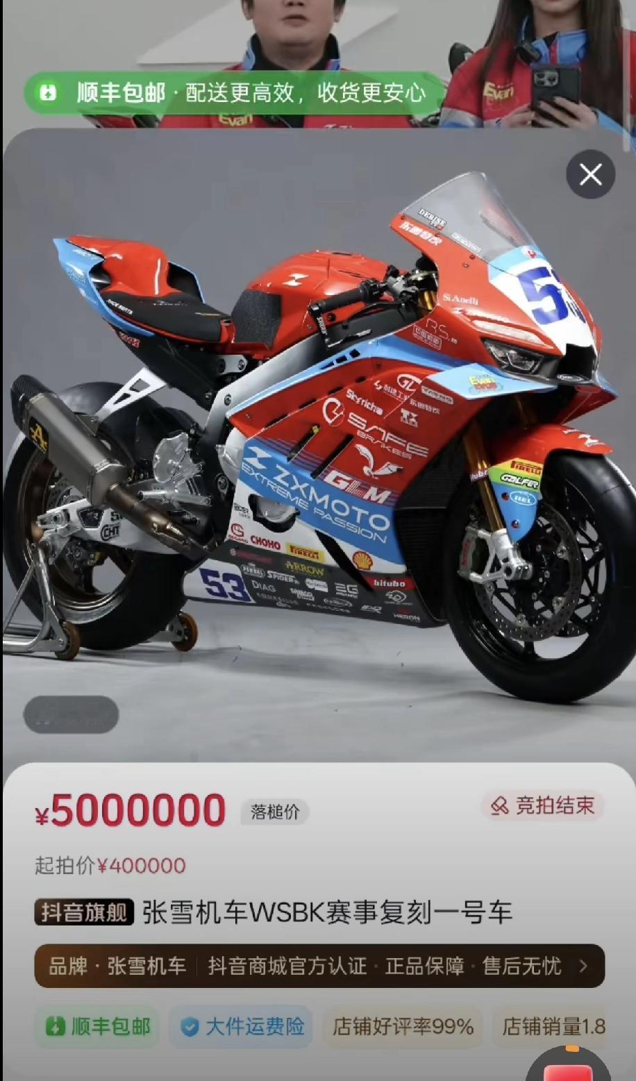 我发现花500万拍下张雪机车复刻版的网友(网名叫“敌敌畏137”,这名字也是没谁了)不是最可惜的,最可惜的是出价498万(网名叫“哪吒不睡觉”)的网友。他要是当时多出2万,他就是竞拍的最终胜出者了。也许有人觉得这个叫“敌敌畏137”的网友太不值得了,花500万买一辆摩托车图啥呀?其实这个“敌敌畏137”是替公司竞拍。要知道现在网络时代,短视频的轰动效应不是传统电视、纸媒能比的了的。这500万最终产生的广告效应比5000万都值。