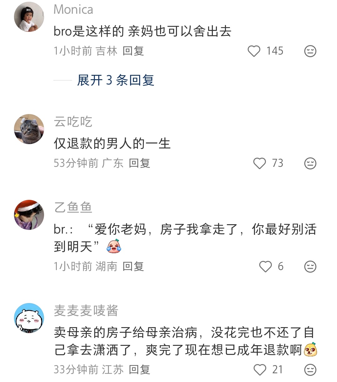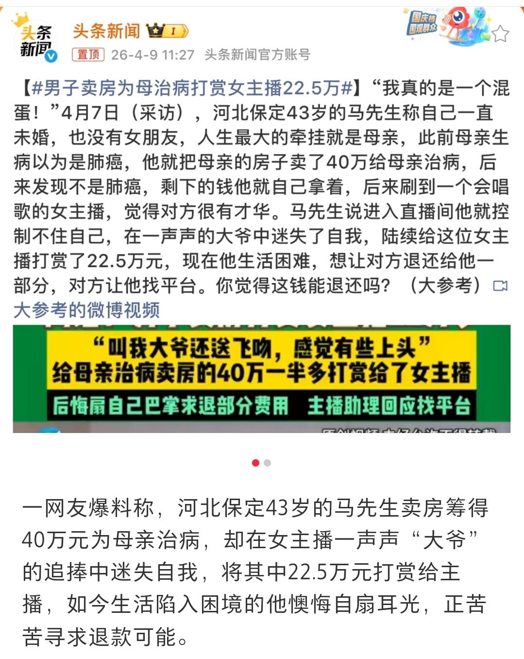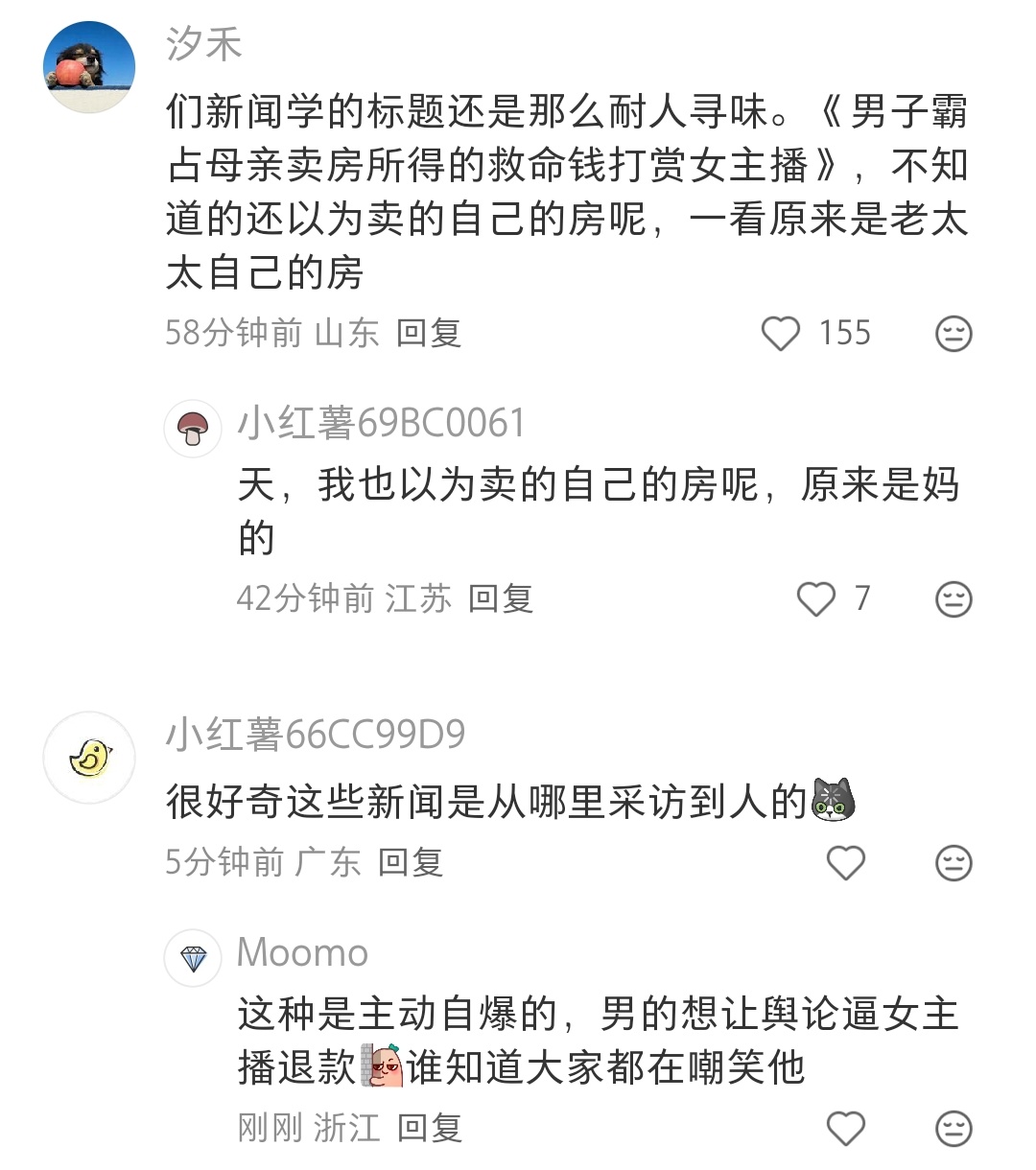 意思这男的把他妈妈的房子卖了,全部吃喝玩乐和打赏女主播了,现在又以母亲要治病为由想仅退款呗