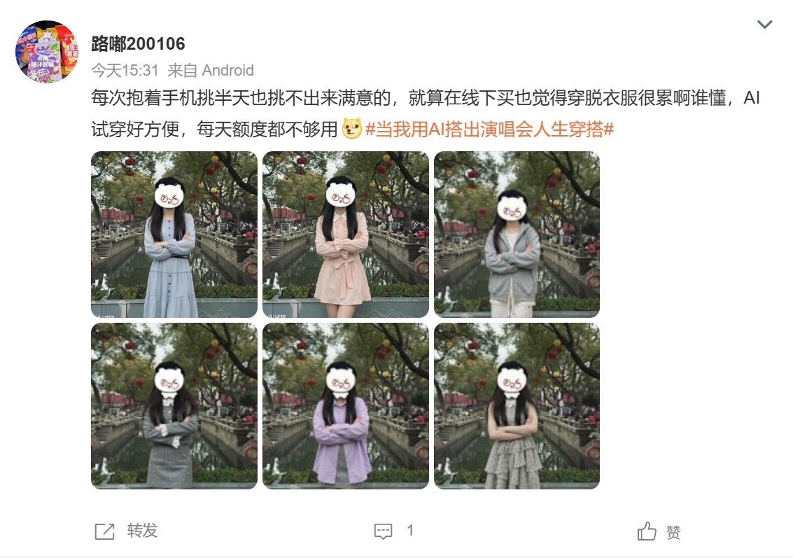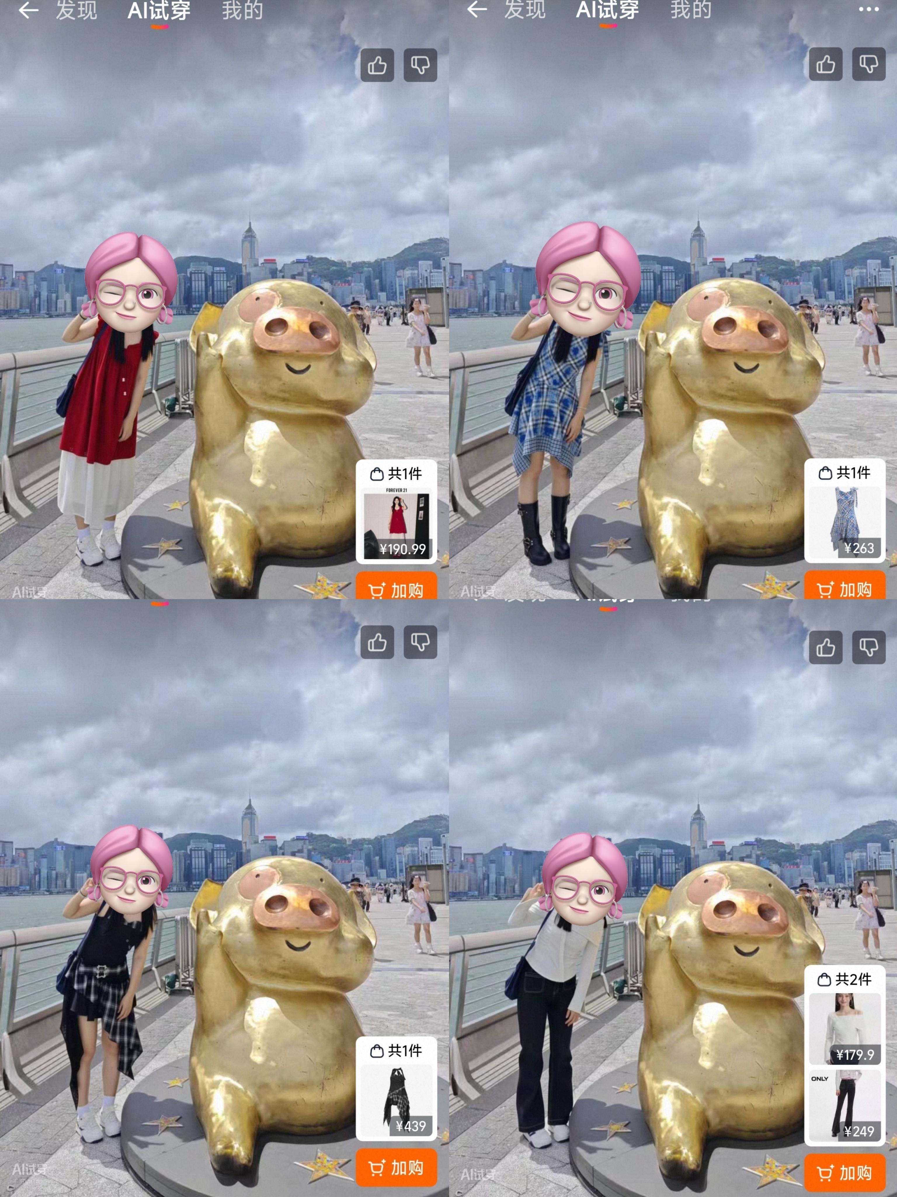 学会了蔡依林演唱会作弊式穿搭到底是谁现在能用淘宝的AI试穿,刷了好多感觉超级方便,购物车和收藏夹的衣服也能直接试啊,眼馋死我了!我命令淘宝现在就让我试!