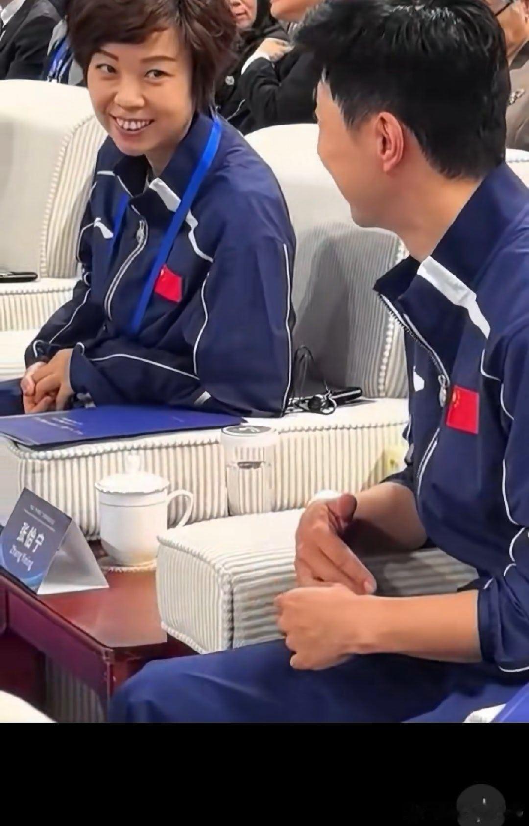 从现场流出的照片可见,张怡宁与马龙均身着带有国旗标识的深蓝色运动套装,胸前国旗徽章格外醒目。两人并肩而坐,张怡宁面带笑意侧身倾听,马龙则手势生动地分享着内容,氛围轻松融洽。桌前的名牌清晰标注着“张怡宁”的名字,进一步确认了这场“跨代对话”的真实性。