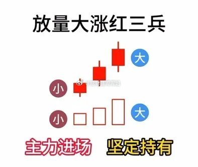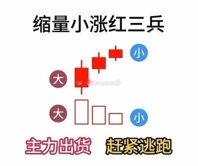不同红三兵,看懂主力动向!!!1. 放量大涨红三兵,乃主力强势入驻之兆,宜坚定持股,静待花开。2. 放量小涨红三兵,显露主力减仓迹象,应提高警觉,防范回调风险。3. 缩量小涨红三兵,暗示主力正悄然出货,投资者宜迅速撤离,规避风险。4. 缩量大涨红三兵,显示强庄锁定筹码,投资者可耐心持有,静待股价攀升,值得收藏!
