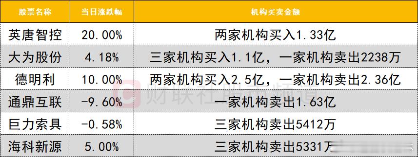 今日龙虎榜机构活跃度有所降低,买入和卖出个股数量减少。英唐智控强势20cm涨停,获两家机构买入1.33亿,同时深股通买入0.28亿。存储芯片人气股德明利续创历史新高,总市值突破1000亿,获两家机构买入2.5亿,同时深股通买入3.79亿,却遭一家机构卖出2.36亿。
