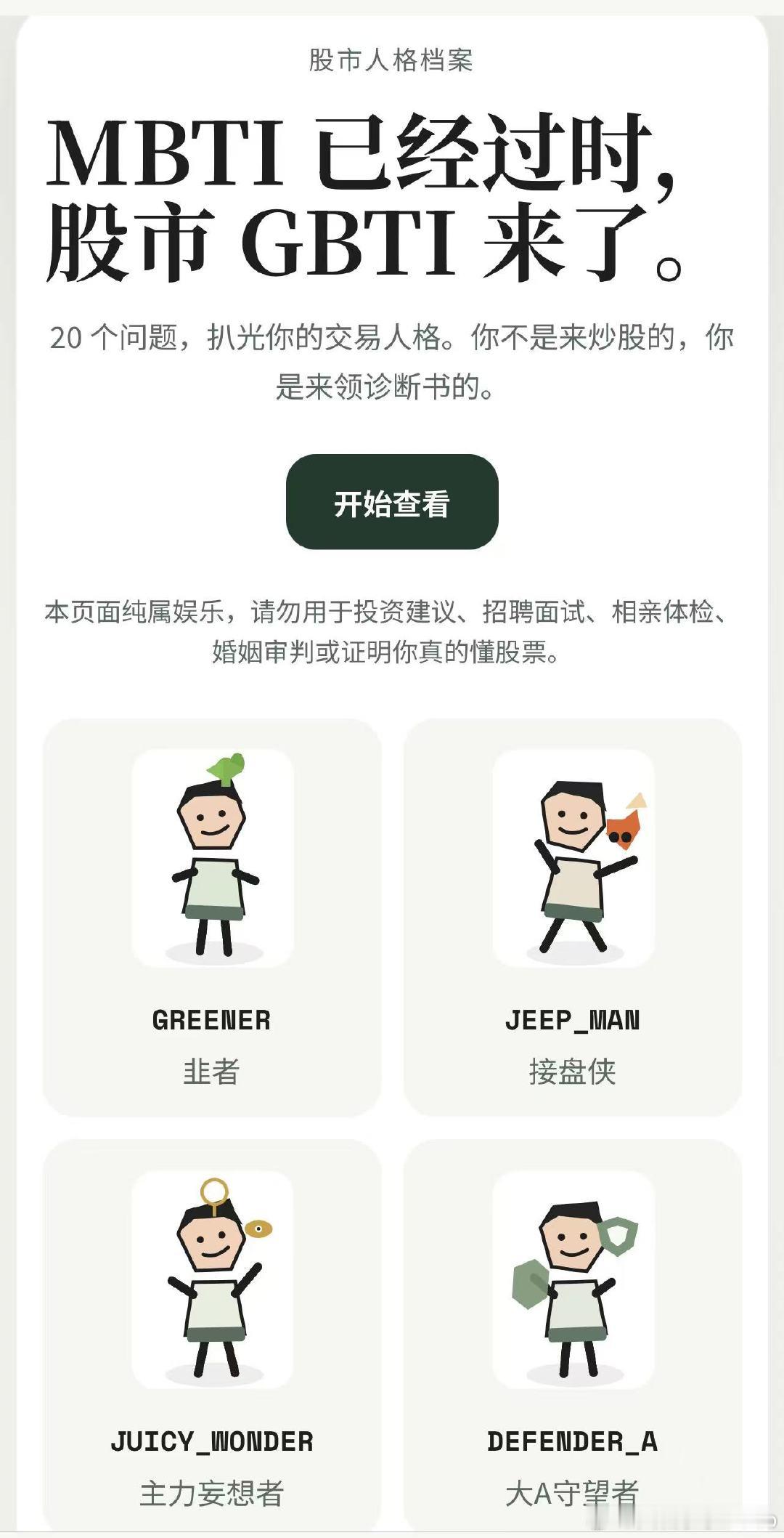 这套测试包括20个与股市交易相关的问题,首页强调“本页面纯属娱乐,请勿用于投资建议、招聘面试、相亲体检、婚姻审判或证明你真的懂股票。”测试结果包括“韭者”“接盘侠”“逃顶大师”“股佛”等14种股市人格。