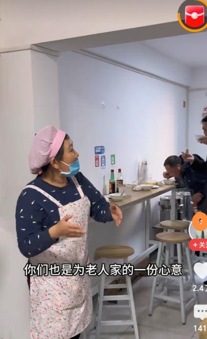 吃饱喝足后,随行的人掏出手机,准备扫码付账,就在这时,老板娘快步走了过来,一把按住了手机,笑着说:“这个老人家能来小店吃饭,是小店的荣耀,不用收费的。”