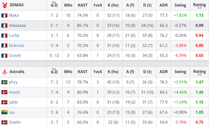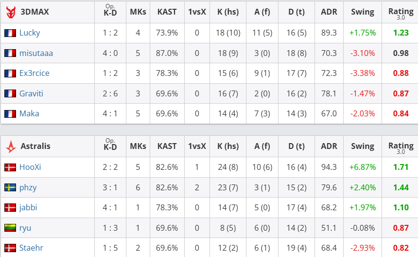 团队数据方面,Astralis团队rating为1.20,优于3DMAX的0.88;首杀数以15-9大幅领先,残局双方各赢一次(1-1)。个人表现上,Astralis方面,phzy砍下22杀、77.0ADR,以1.50rating成为全场最佳;jabbi贡献17杀14助攻,rating1.33;ryu和HooXi也分别有15杀入账;3DMAX的Maka砍下18杀、11次助攻、87.1ADR,以1.47rating领跑全队;misutaaa贡献15杀,rating1.03。但全队关键比分失利最终丢掉自选图。此役过后,Astralis在BO3中先下一城。