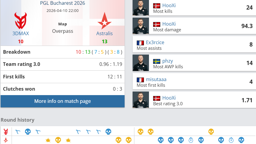 虎扑04月11日讯PGL布加勒斯特半决赛,3DMAX对阵Astralis比赛结束,3DMAX0-2Astralis。HooXi文武双全!A队力克3DMAX挺进决赛。