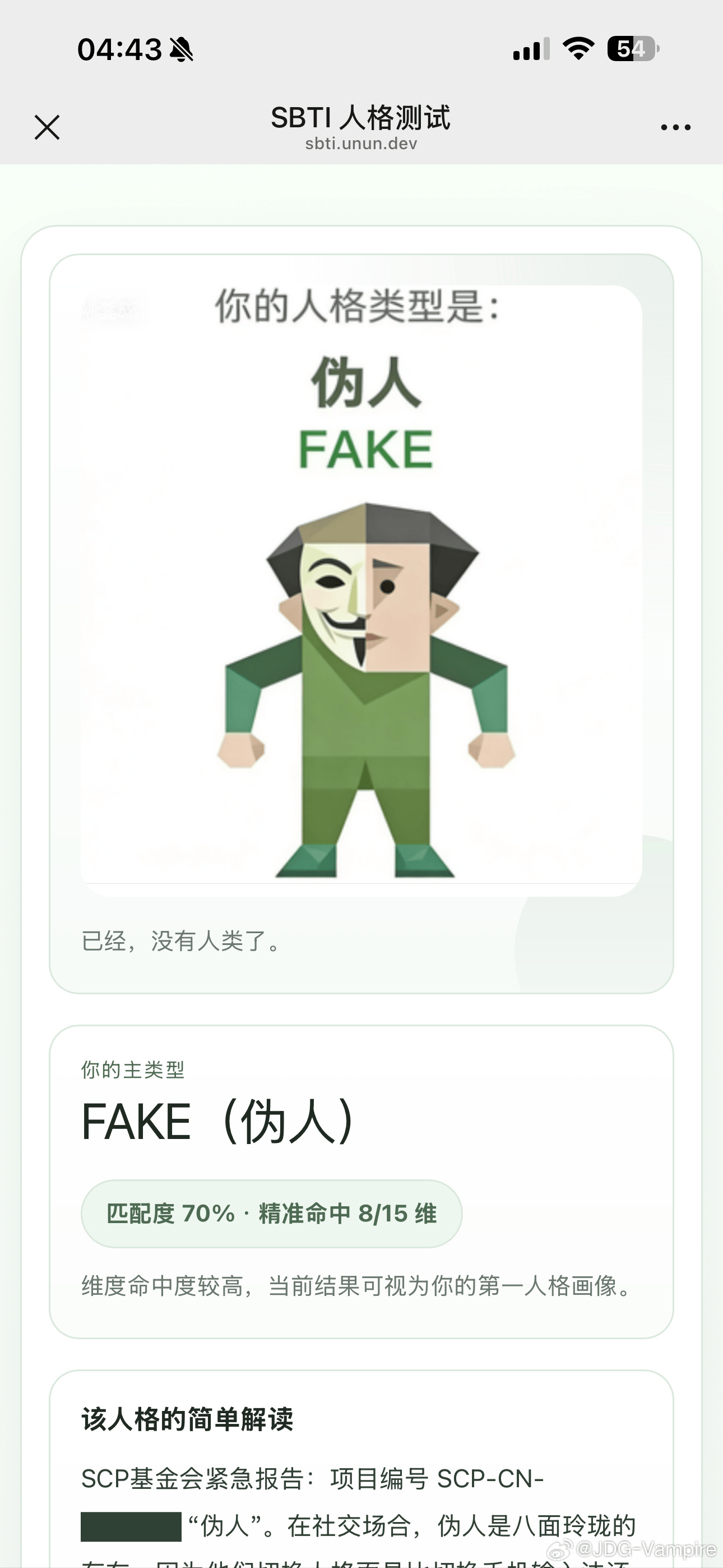 虎扑04月10日讯战胜AL后,Vampire分享SBTI测试并配文:兄弟们打得太好了明天继续加油!大家都是什么?
