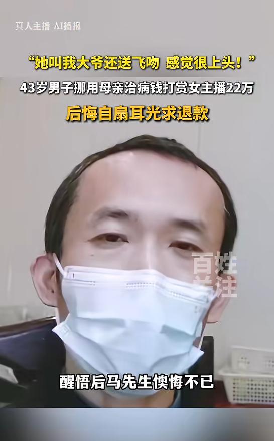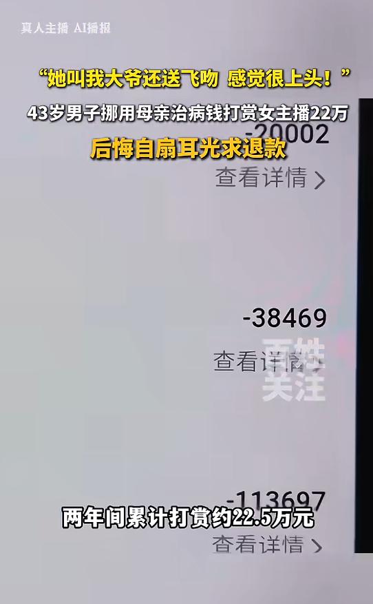 (信息来源:《“她叫我大爷还送飞吻,感觉很上头!”43岁男子挪用母亲治病钱打赏女主播22万,后悔自扇耳光求退款。》百姓关注)