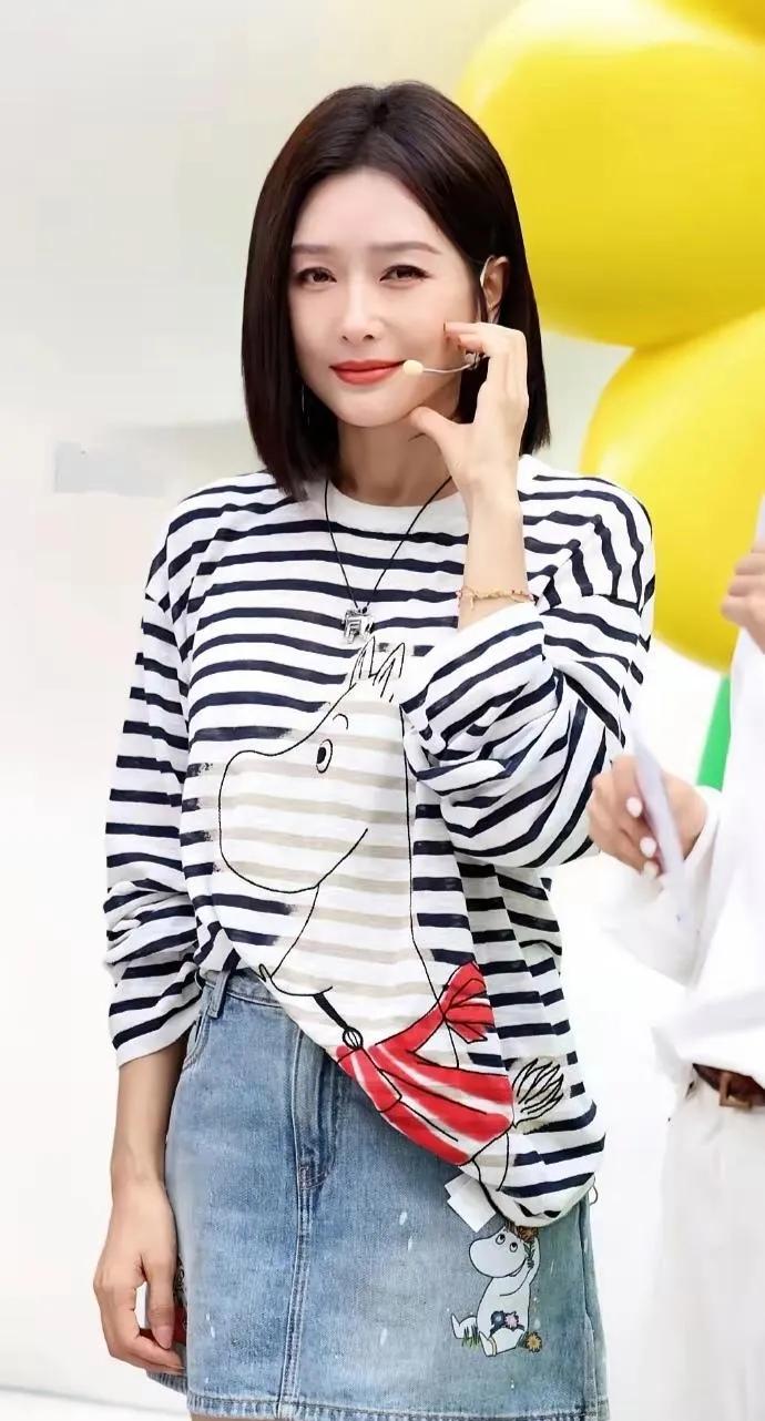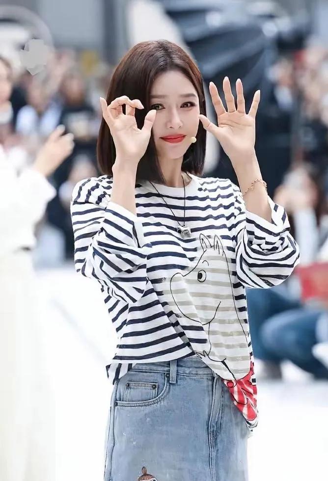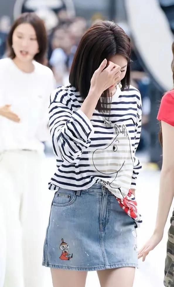利落短发+条纹海魂衫+牛仔半裙,清爽又减龄,甜妹感直接拉满!