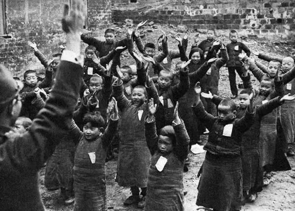 照片是蒲圻附近的一处村庄,一群身着粗布长衫、胸前佩戴统一白色标识的中国孩童,整齐列队站在村中空地上,同步举起手臂,跟随日军教官的示范动作做体操。左侧,一名日军背对镜头,抬手示范动作,全程引导着这场体操训练,这类活动是日军在占领区推行殖民统治的组成部分,既用于日常教化,也用于对外宣传。