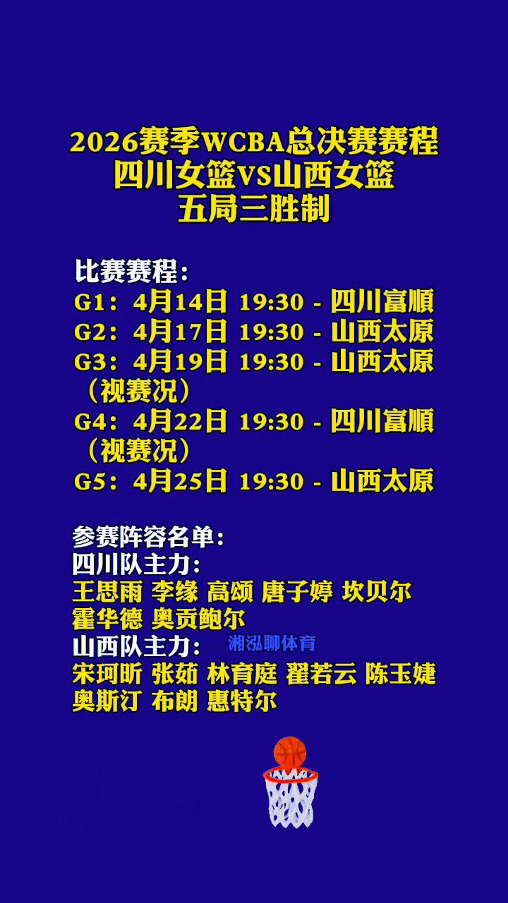 2026赛季WCBA总决赛赛程:四川女篮vs山西女篮,五局三胜制。 比赛赛程:
