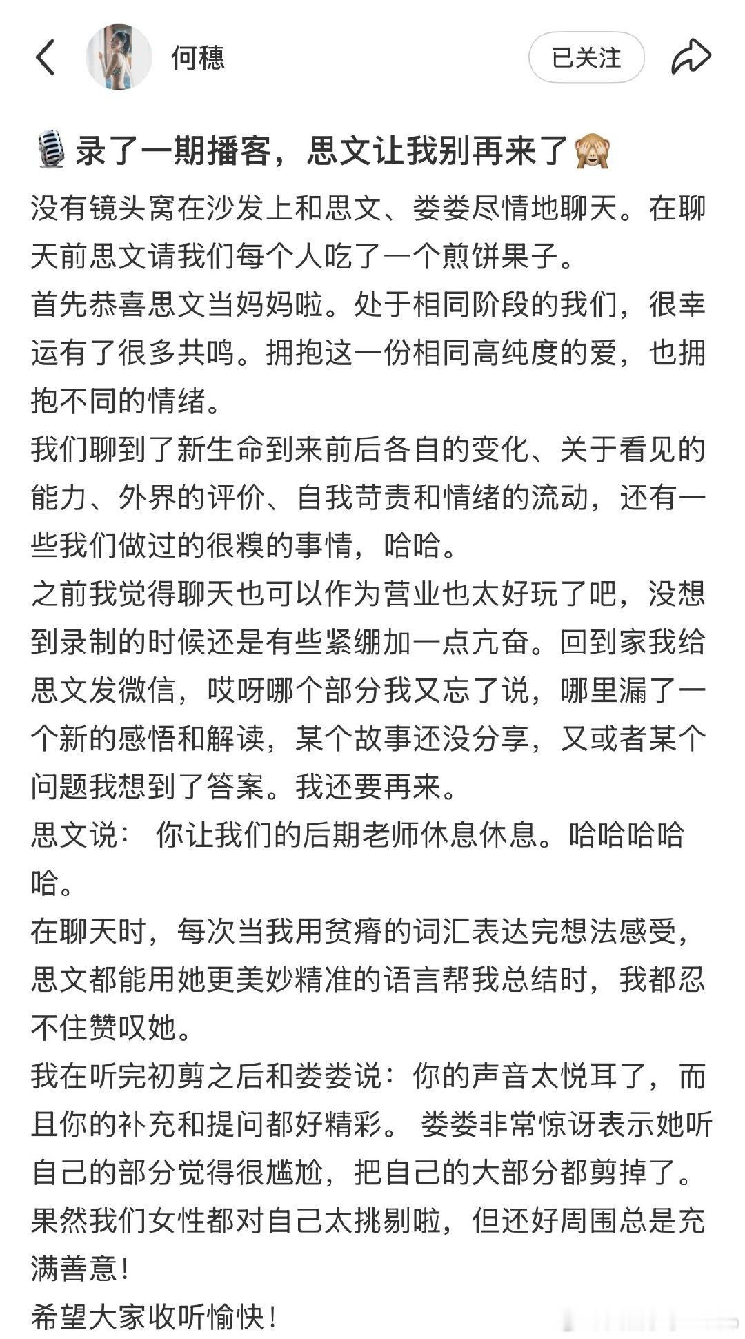 【何穗恭喜思文】何穗说和思文有了很多共鸣4月10日,何穗在社媒发文:“首先恭喜思文当妈妈啦。处于相同阶段的我们,很幸运有了很多共鸣。拥抱这一份相同高纯度的爱,也拥抱不同的情绪。我们聊到了新生命到来前后各自的变化、关于看见的能力、外界的评价、自我苛责和情绪的流动,还有一些我们做过的很糗的事情,哈哈。”