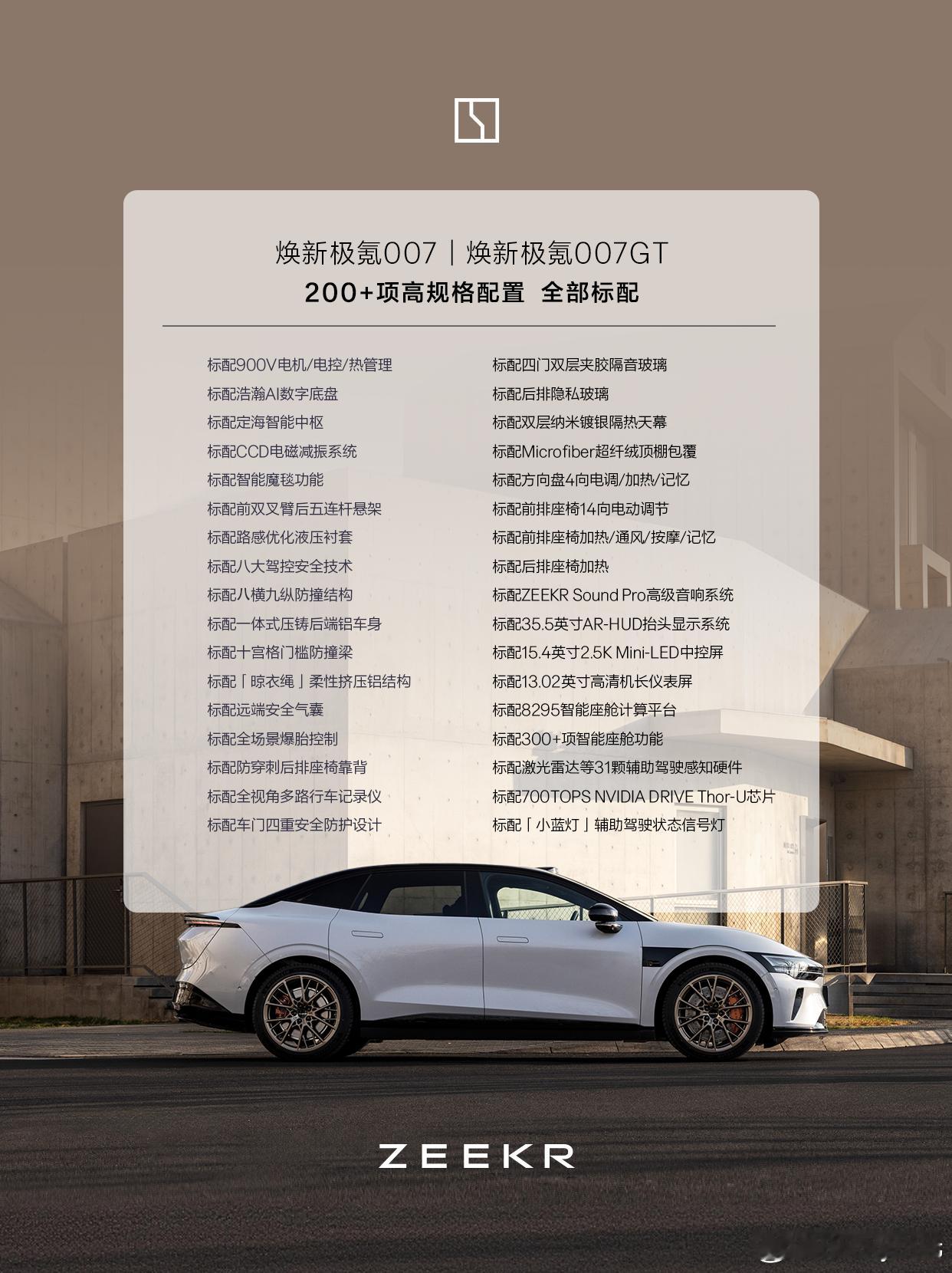 极氪焕新7系正式上市了,007和007GT上市权益后限时价都是19.39万-23.39万。升级到900V高压平台后整个硬件底子变了:007零百快至2.73秒,007GT四驱2.85秒;103度麒麟电池+6C超快充,10%-80%快至10分钟;浩瀚AI数字底盘+闭式空悬+CCD电磁减振,操控和舒适都往上拉了一档!全系标配激光雷达+31颗感知硬件,“公路坦氪”继续加码007GT依然是超能装的性能车,645L后备厢拓展到1737L,车顶承重150kg,还有1.6吨电动拖车钩。通勤、露营、滑雪一台全搞定。20万级这个综合实力,值得认真看看。一秒看透极氪安全黑科技极氪更强7系更强GT