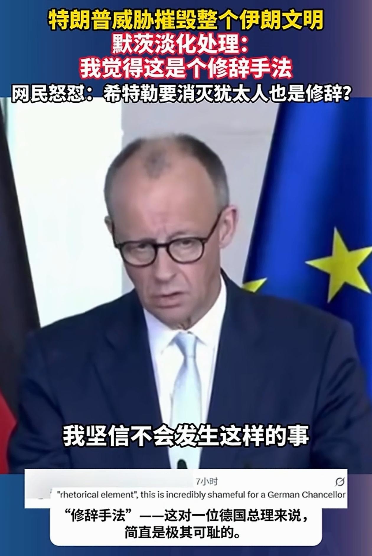 德国总理默茨今天(4月10日)在记者会上表示:“以色列对黎巴嫩南部采取的军事行动,破坏了中东和平进程,德国绝不允许这种情况继续发生。”在被问及美国总统特朗普威胁摧毁整个伊朗文明时,默茨回应称,“这只是特朗普对伊朗战略的一个修辞手法,我坚信这种情况不会发生”。网民怒怼称:希特勒要消灭犹太人也是修辞?德国总理能说出这样的话是极其可耻的。当下的欧洲,真正做到独立自主还有很长的路要走。