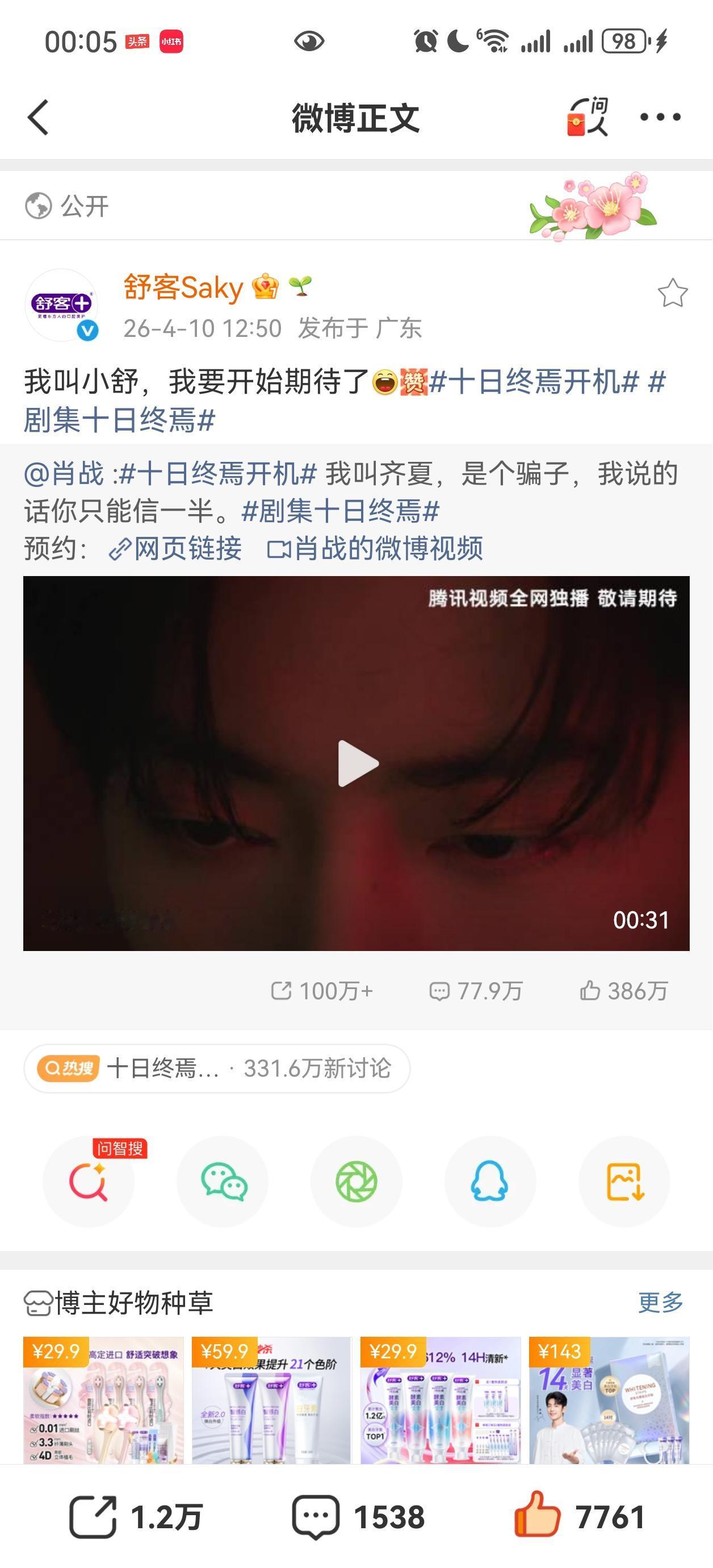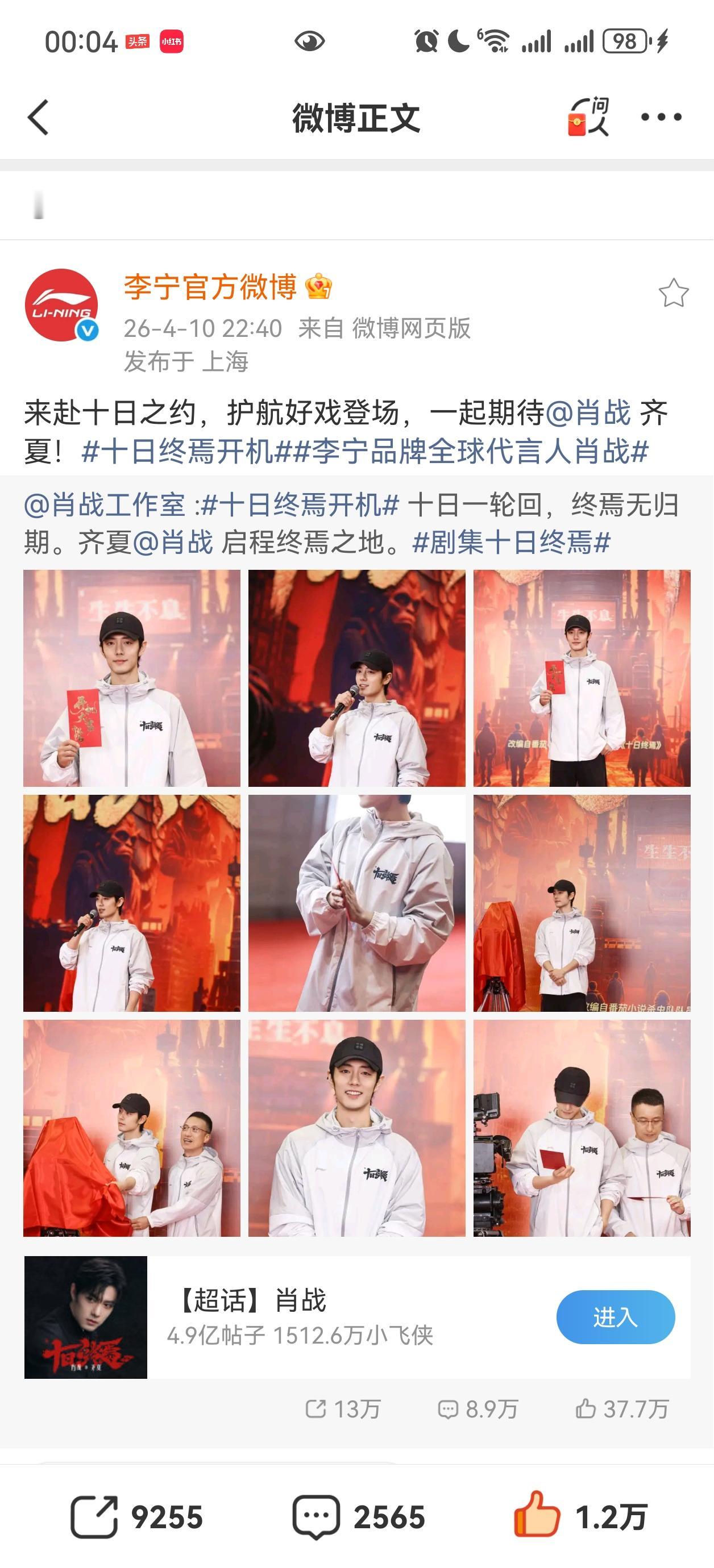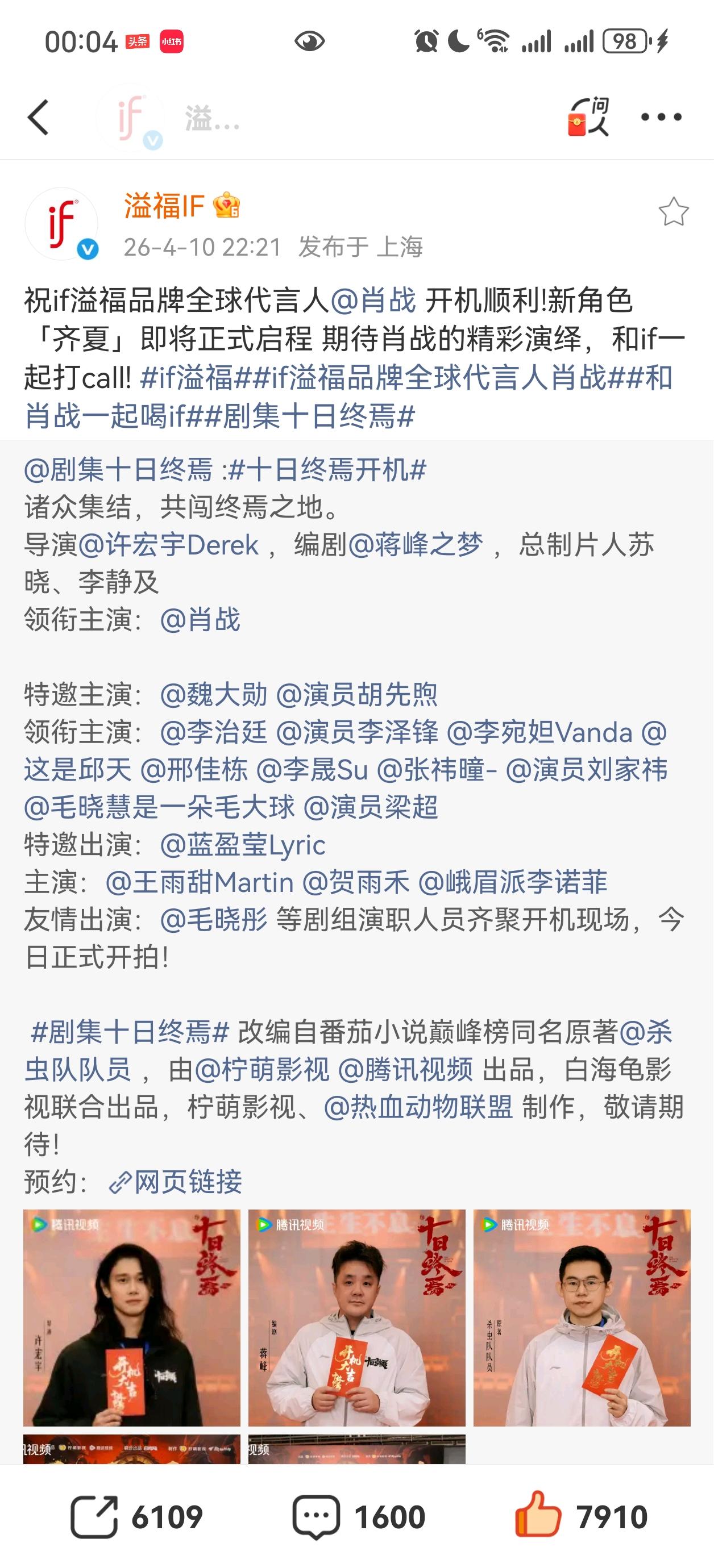 青岛啤酒,if椰子水,李宁,舒客都祝贺肖战主演的十日终焉官宣[祝福][祝福][祝福]