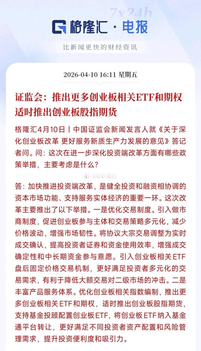 A股收盘之后,证监会发布重磅利好,科技股的春天来了证监会:进一步增强创业板支持新兴产业,推出更多的创业板相关的ETF。简单的说就是:创业板不再是随便什么公司都能上,重点只扶持新技术、新产业、新模式的企业,比如AI、芯片、机器人、新能源、新材料这些,有实力的就上市 没有硬科技的就不要瞎掺和了。