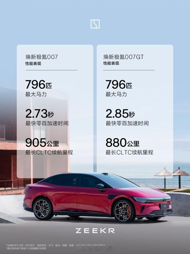 焕新极氪007,零百加速最快2.73s,后驱版4.6s,CLTC续航里程最长达905km;焕新极氪 007GT,零百加速最快2.85s,后驱版4.8s,CLTC续航里程最长达880km。