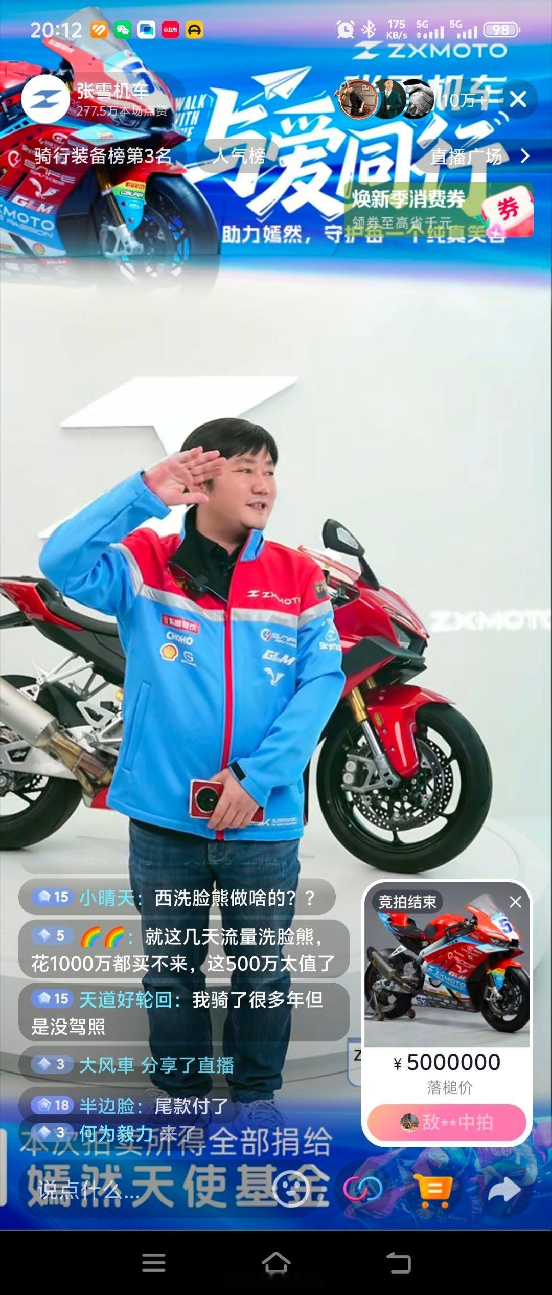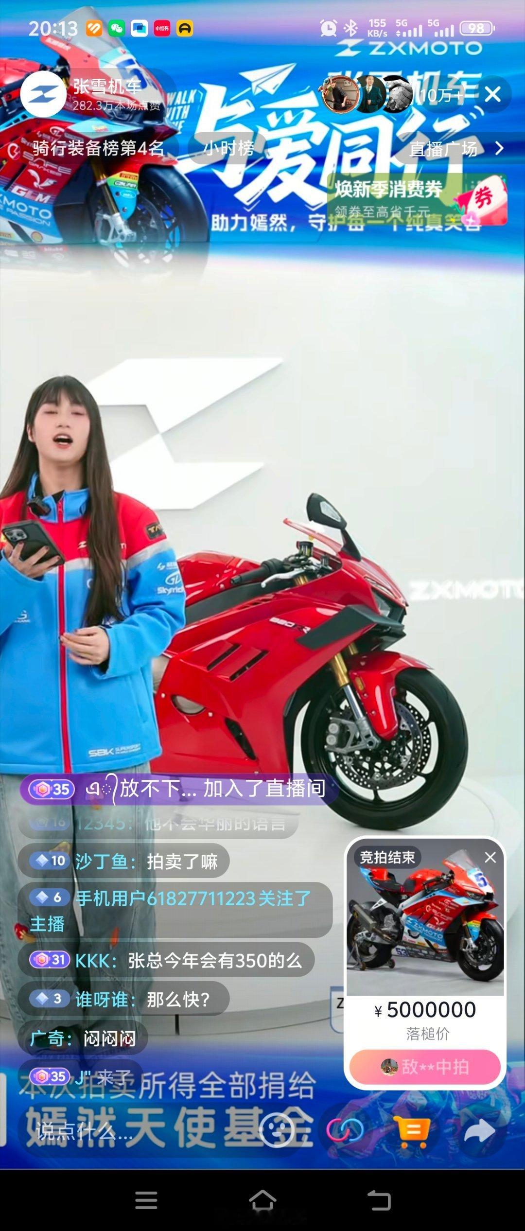 张雪820冠军复刻赛车,抖音直播间1分钟500万封顶成交!所得款项全部捐赠嫣然天使基金。