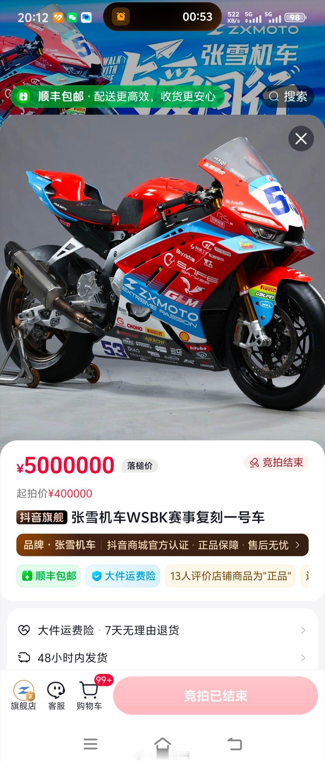 张雪比赛冠军车型复刻版被人以500万元价格拍下!张雪机车此场直播共吸引了超过