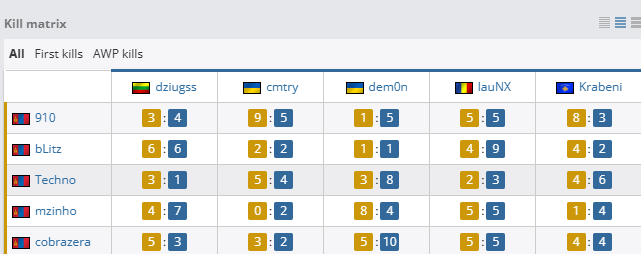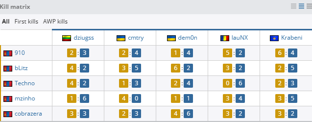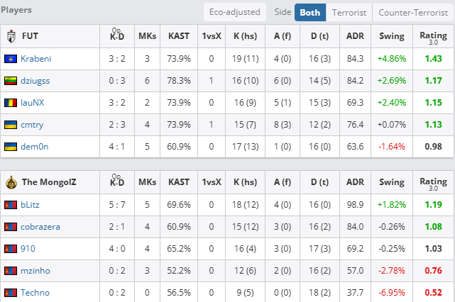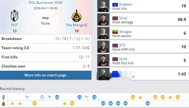 个人数据方面,FUT全员手感火热,Krabeni更是拿下19次击杀与1.43的rating冠绝全场。而TMLZ方面仅有bLitz发挥不错,拿到18次击杀和1.19的rating。