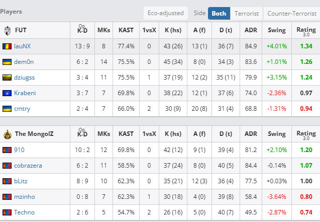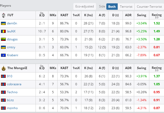加时赛上半场,TMLZ进攻依旧太过犹豫,无法形成破点,TMLZ加时赛T方连丢两分,依靠B点提速艰难拿下加时赛第一分;来到加时赛下半场,TMLZ手感回暖,bLitz与cobrazera拿下双杀,比分再次追平,次局FUT继续选择提速成功,FUT拿下关键赛点。最后一局,FUT展现战术变化,TMLZ猝不及防被一波带走。