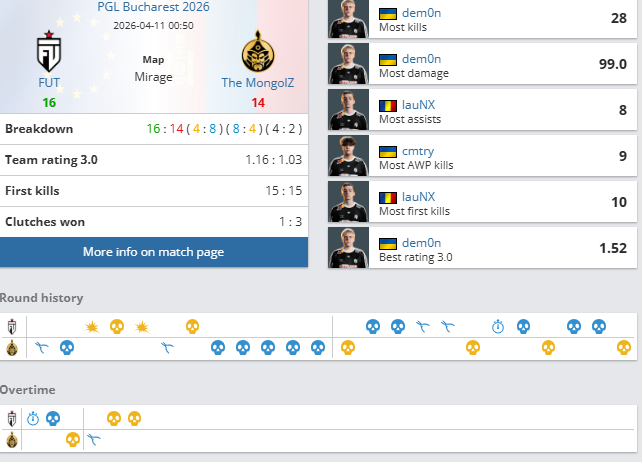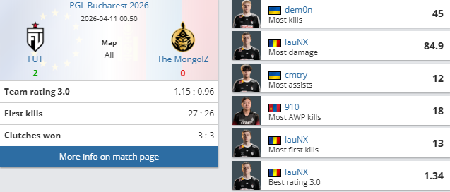虎扑04月11日讯PGL布加勒斯特半决赛,FUT对阵TheMongolZ比赛结束,FUT2-0TMLZ:青春风暴!FUT直落两盘晋级决赛