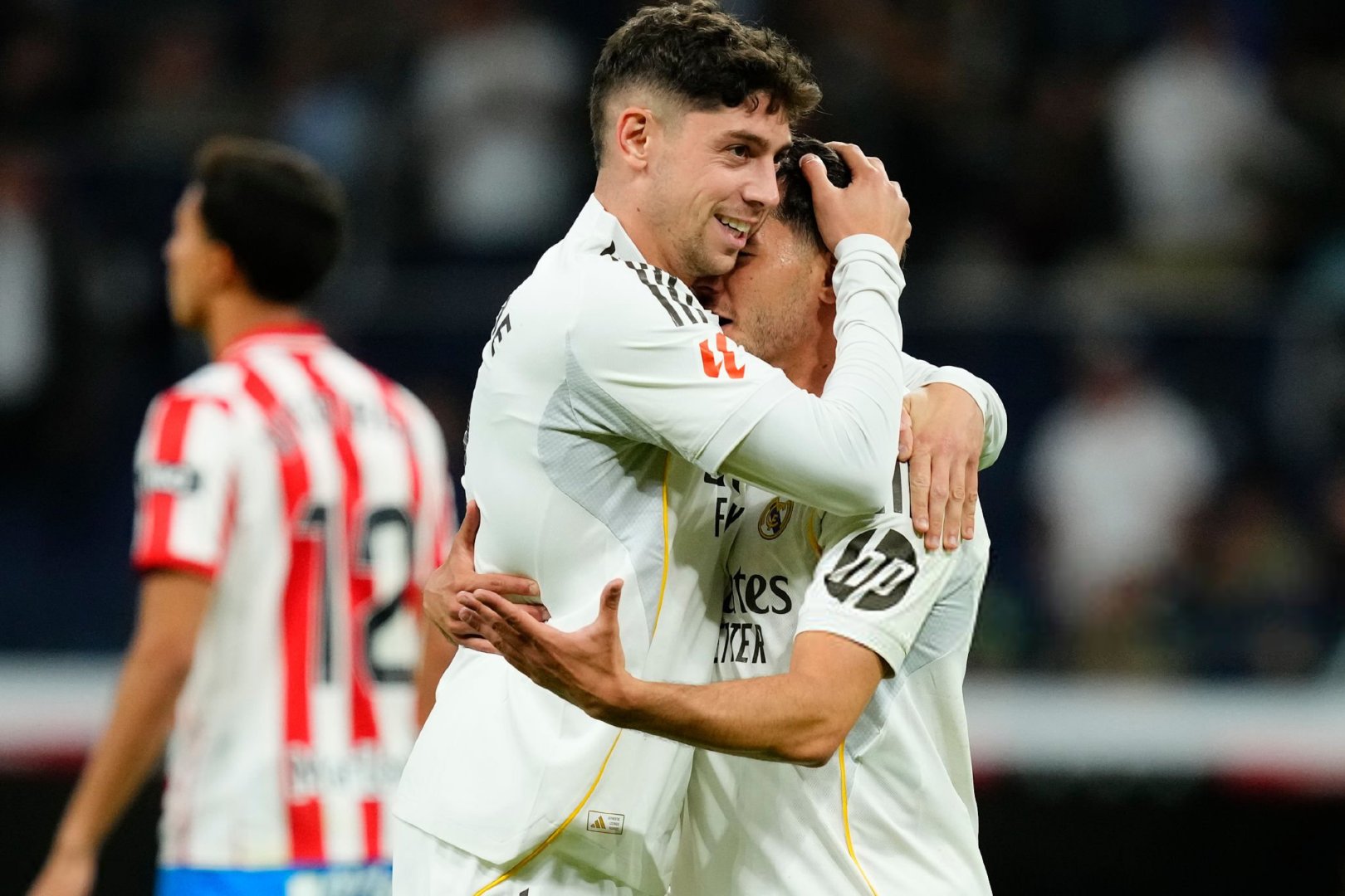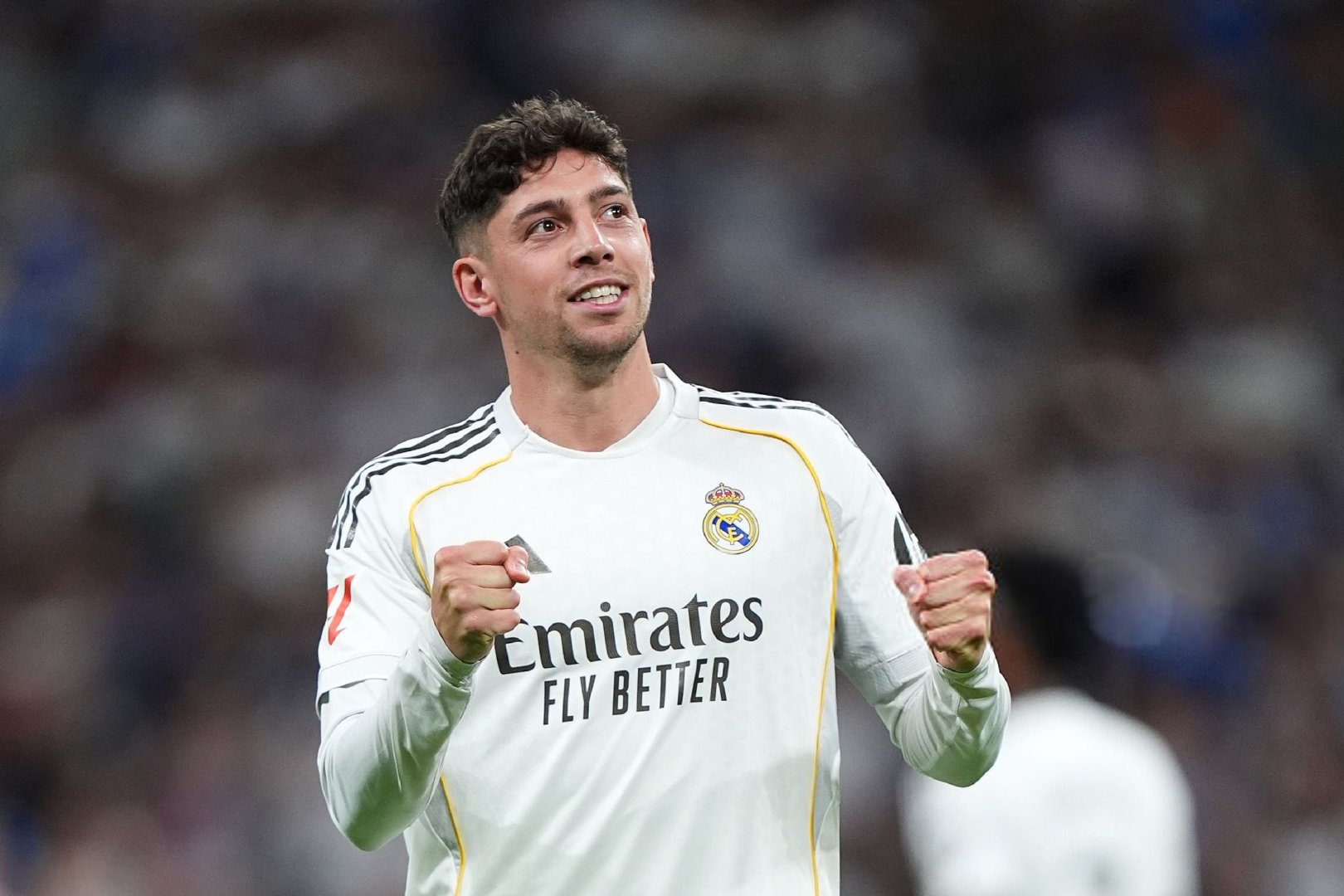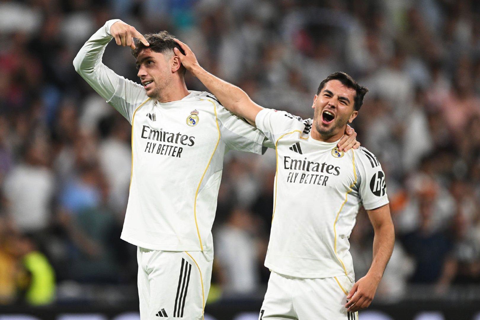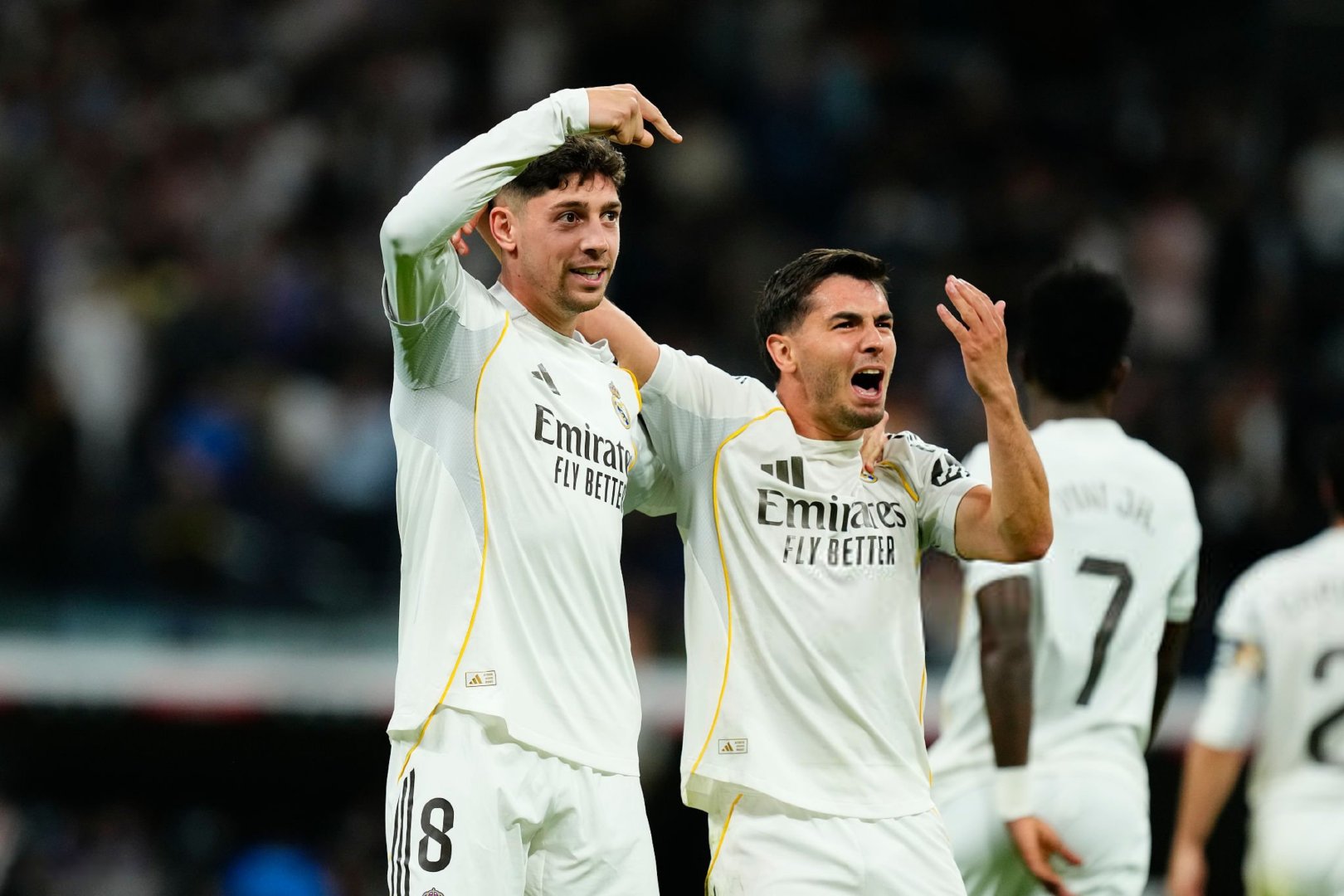 巴尔韦德双脚离地的重炮,他示意球迷,这个球多亏了卜拉欣的助攻。西甲联赛 皇马vs