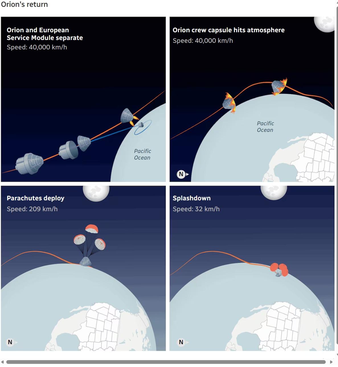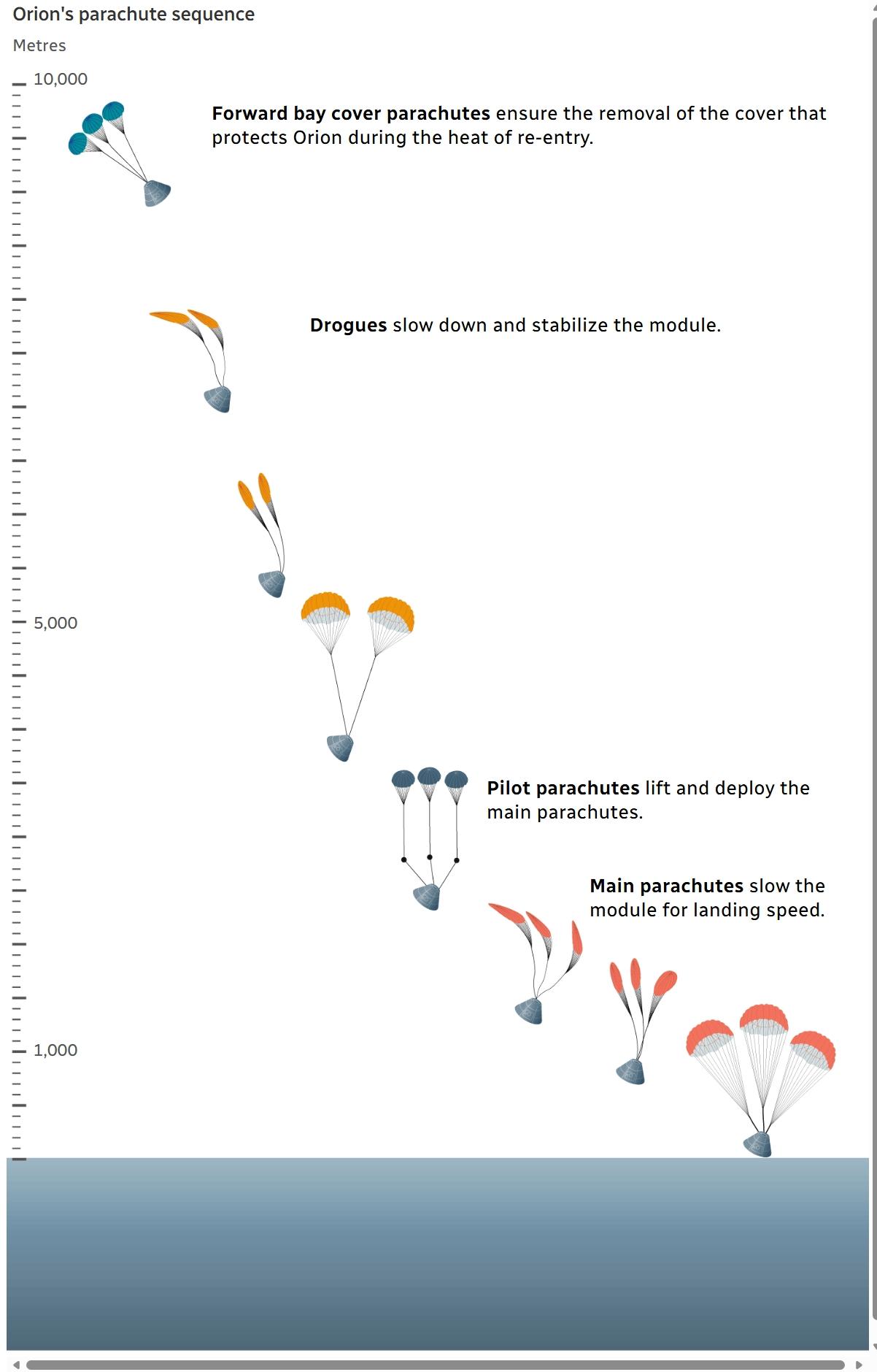 一系列降落伞展开将于东部时间晚上8:03开始,以减缓猎户座下降速度,主降落伞将在东部时间晚上8:04释放。