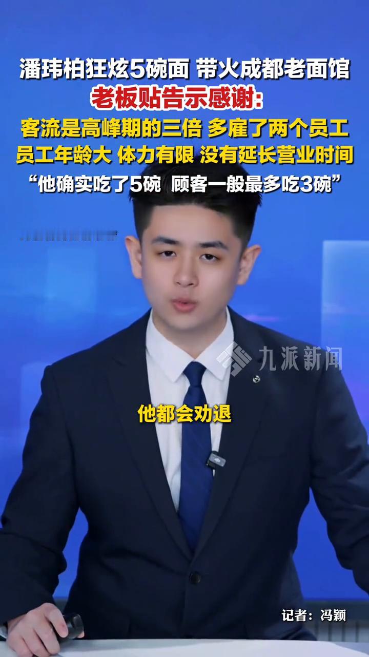 潘玮柏狂炫5碗面带火成都老面馆,老板贴告示感谢:客流是高峰期的三倍,多雇了两个员工,员工年龄大、体力有限,没有延长营业时间。"他确实吃了5碗,顾客一般最多吃3碗"。