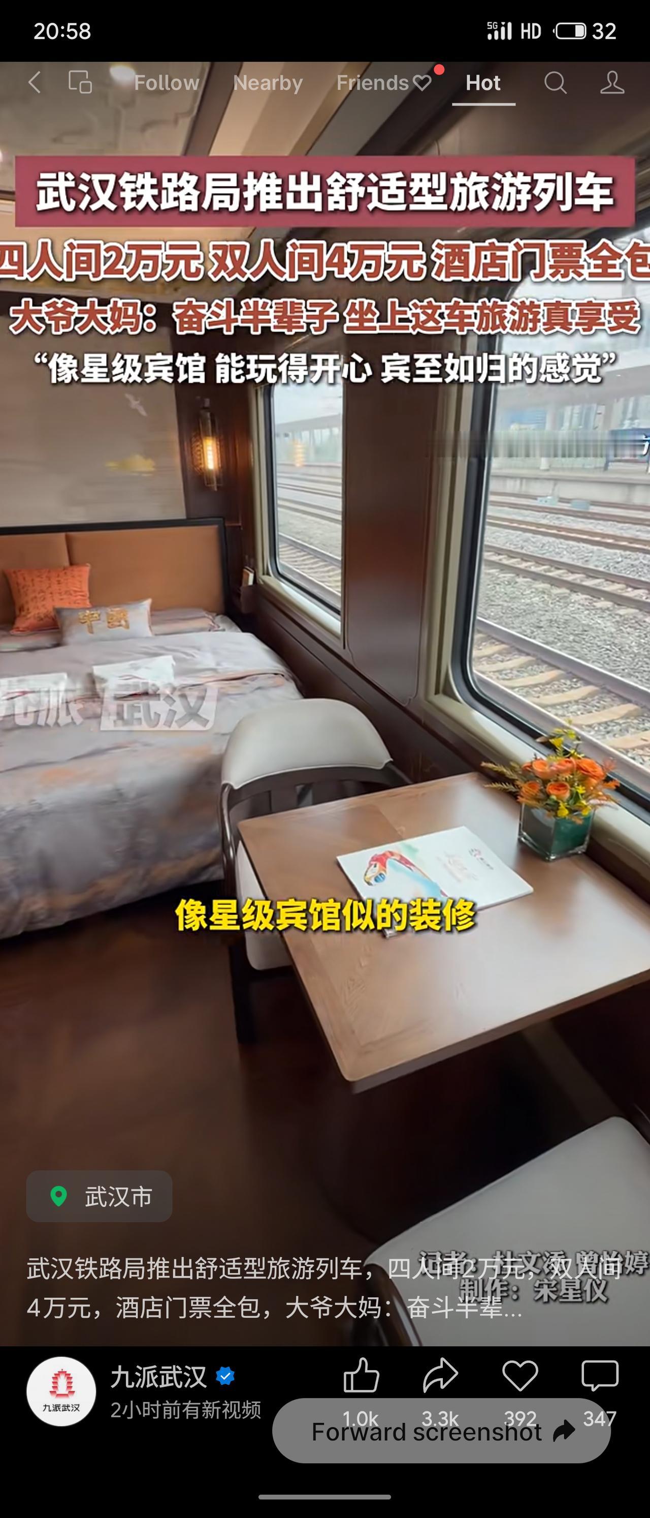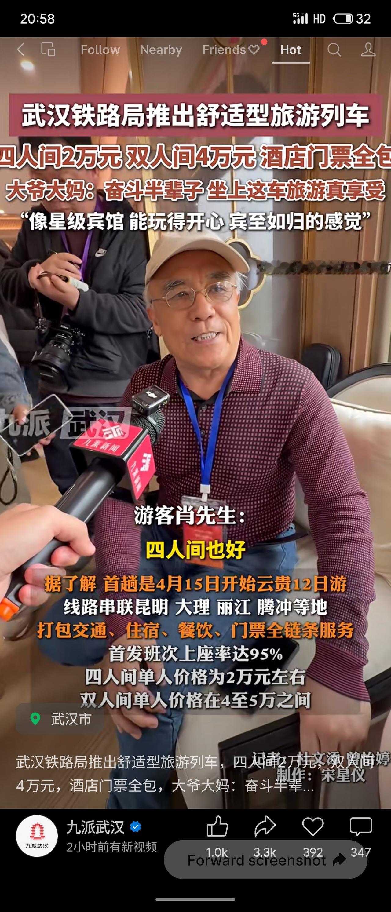 武汉铁路局推出“舒适型旅游列车”,由18节绿皮火车升级改造,主打“星级宾馆”体验。四人间每人约2万元,双人间每人4-5万元,打包交通、住宿、餐饮、门票。首趟4月15日云贵12日游,串联昆明、大理、丽江、腾冲,上座率达95%。大爷大妈感叹“奋斗半辈子,真享受”。