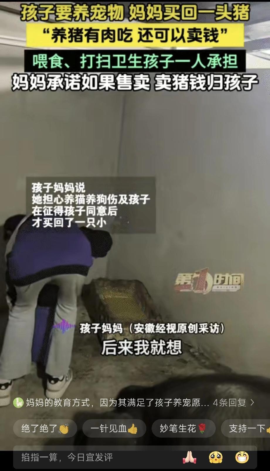 这位妈妈提出卖猪的钱全部归孩子,看似是给孩子的物质奖励,实则是在对孩子进行最贴合生活的财商启蒙。