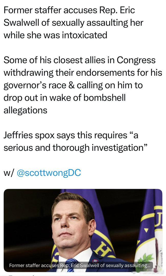 民主党加州众议员、参选下任加州州长的大热门Swalwell,被前下属指控“性侵”