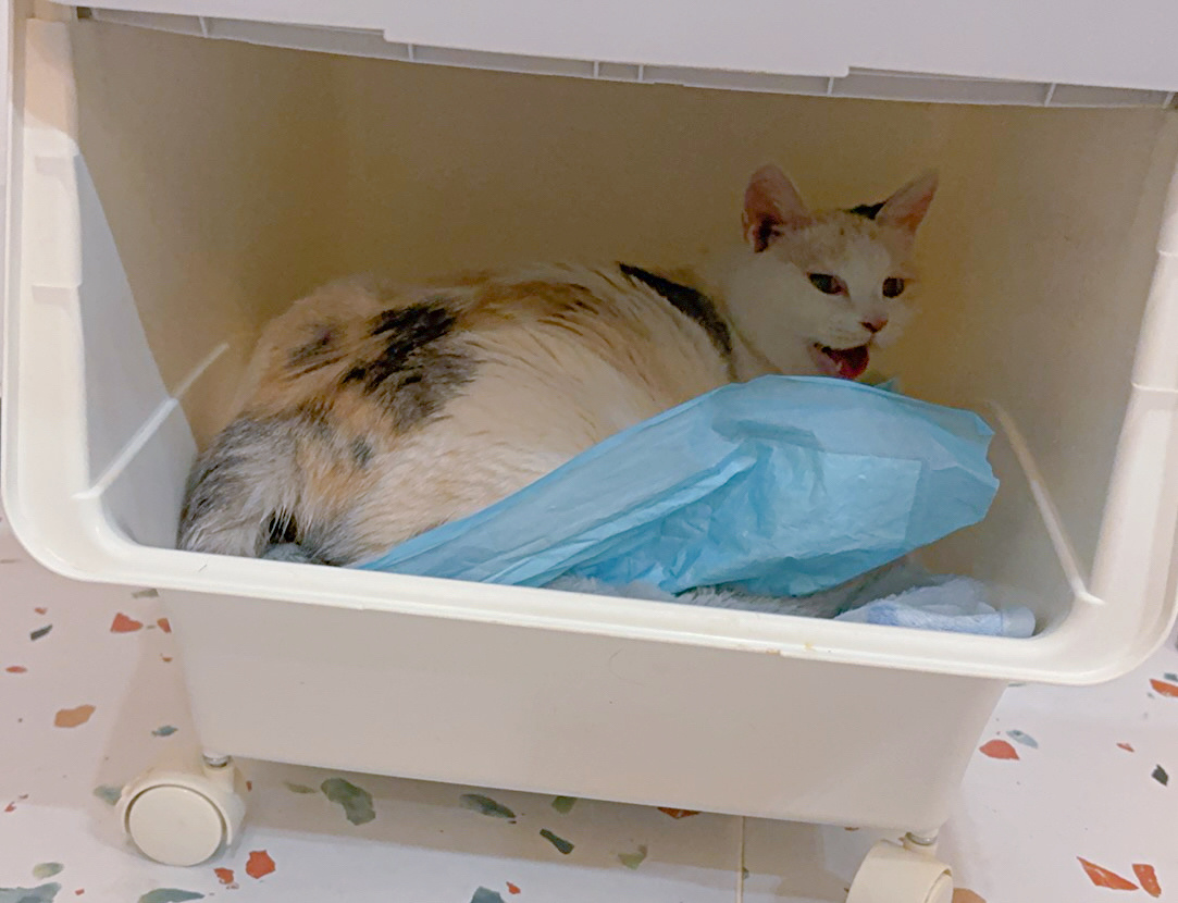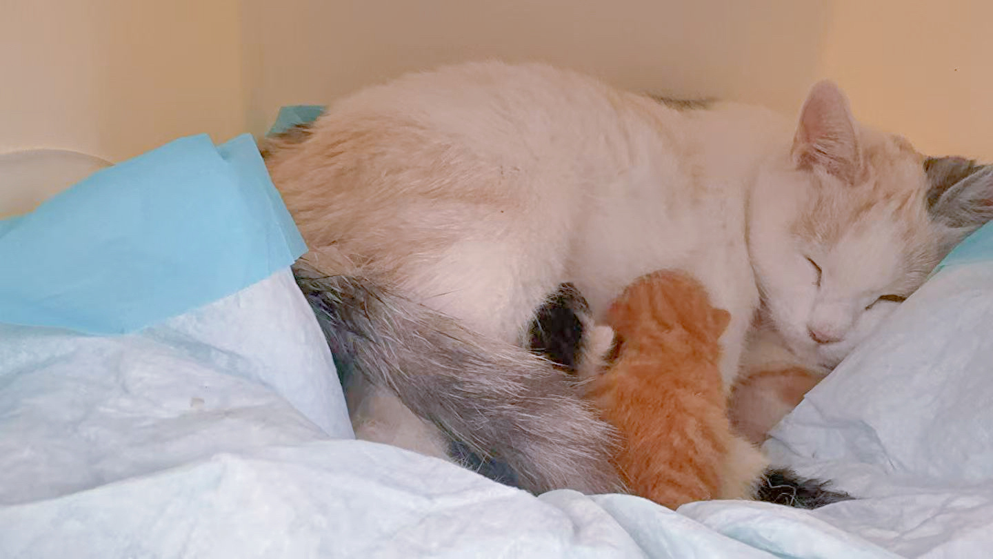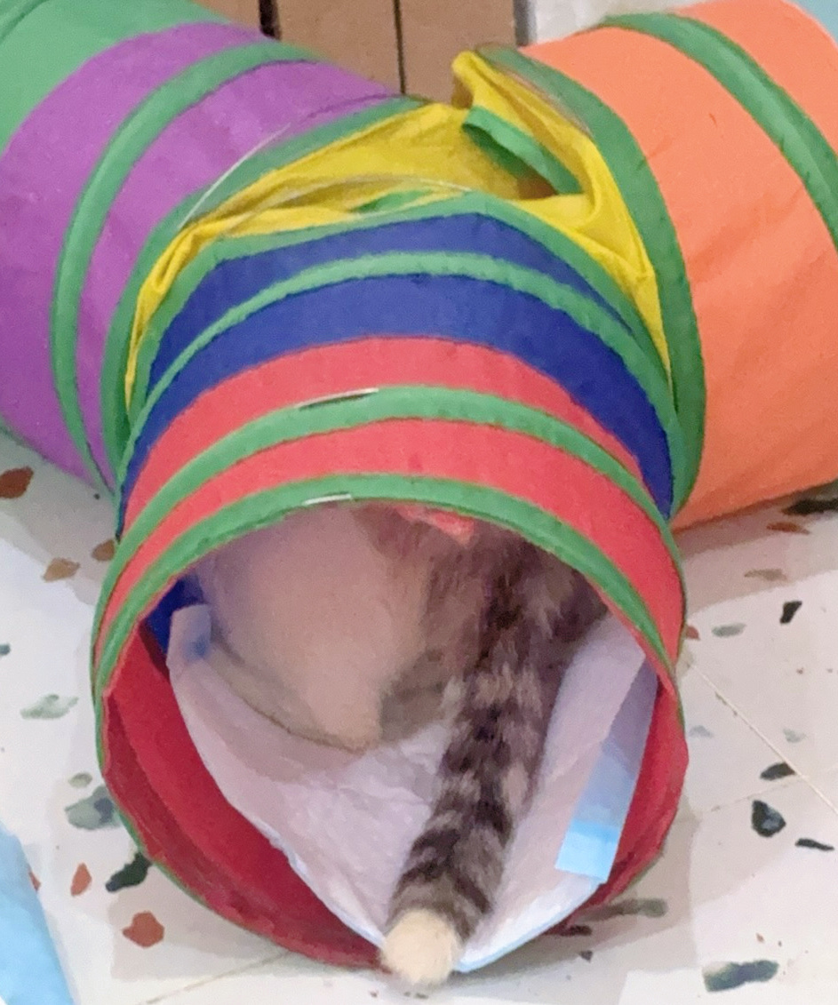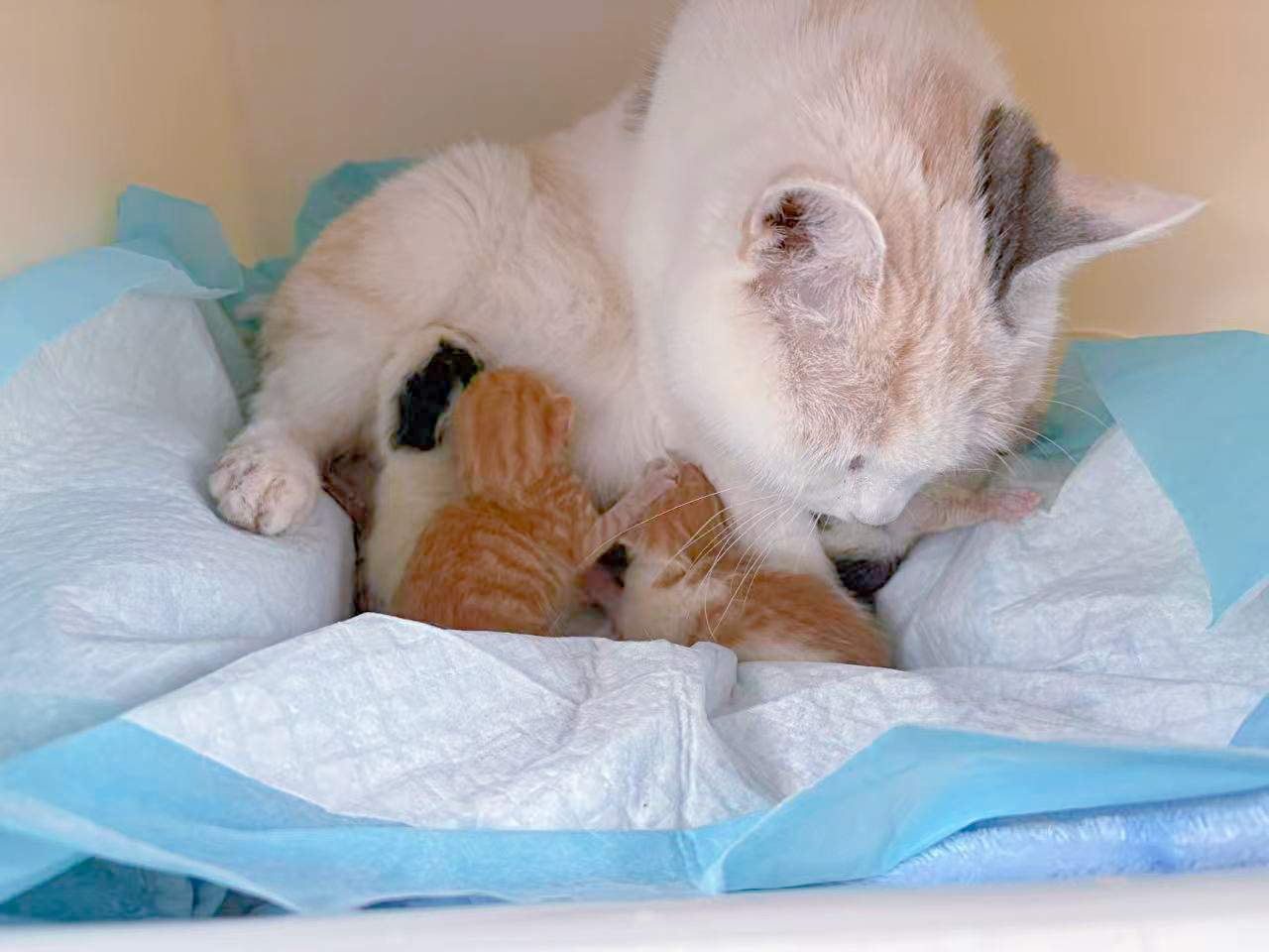 我陪三彩待产到凌晨2点,实在坚持不住去睡觉了,今早6点多,一睁眼,直奔客厅……发现我的三彩把孩子生下来了——两只橘猫两只奶牛。生在了蛋妞生第一个孩子的那个隧道,事先铺的尿垫子被血水浸透了。四个孩子都比蛋妞的要瘦小,体温有点低,好在活力还不错。