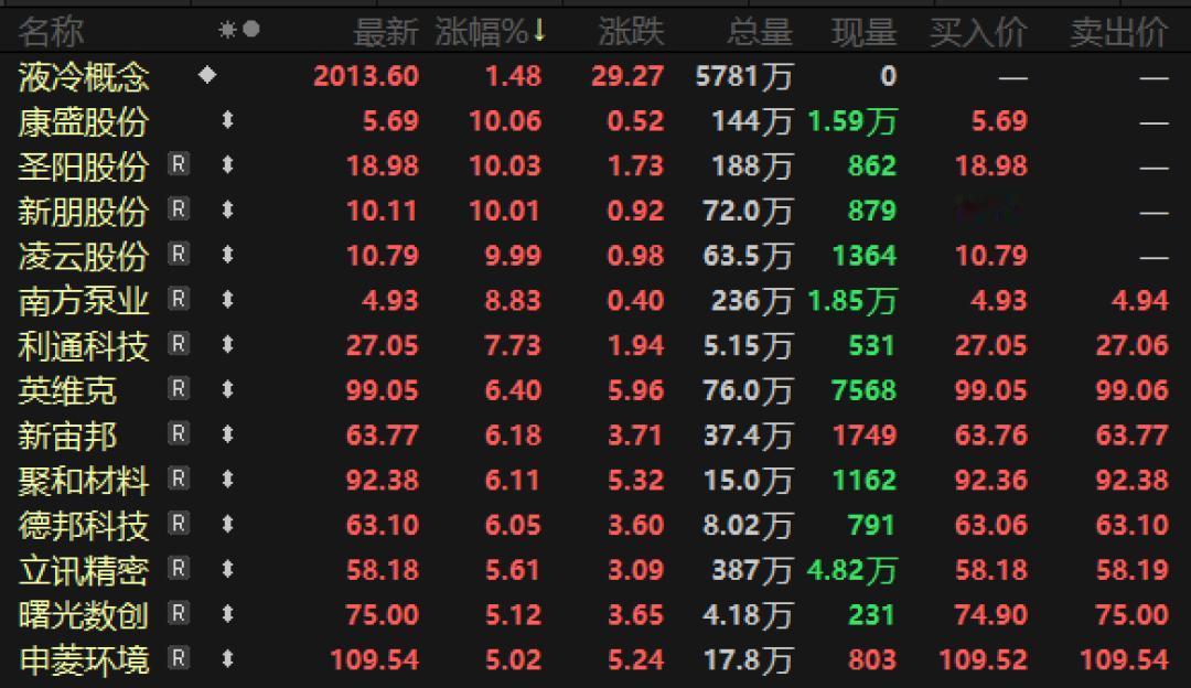 资本市场的反应最为直接。液冷概念板块今日大涨1.48%,康盛股份、圣阳股份、新朋股份等多股涨停,南方泵业、利通科技等跟涨,资金抢筹迹象明显。