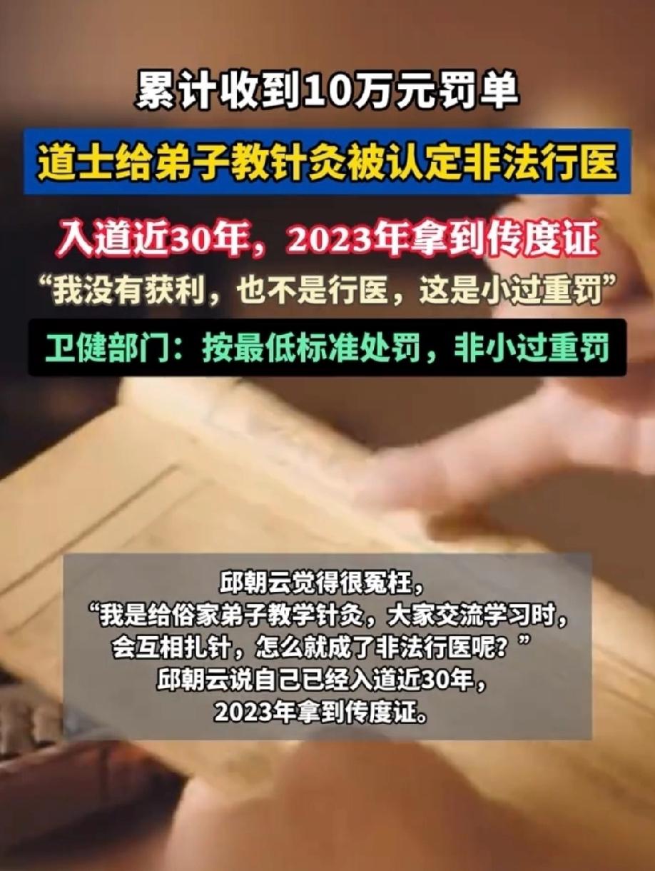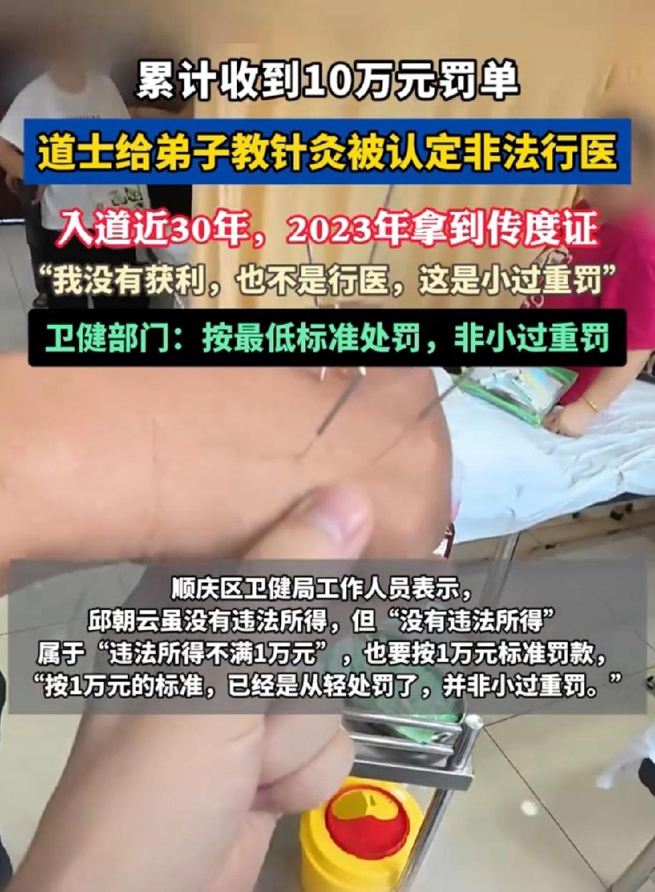冤不冤?四川南充,一道士给几个俗家弟子教针灸,不慎导致其中一名弟子休克,结果遭到几个弟子的投诉,理由是他没有行医资格证,更没有收徒的教职证。卫健部门介入后,累计给道士开出10万元的罚单,道士委屈不已:我给弟子们教针灸只是互相交流学习,并没有非法行医,况且,我退还了收徒费,也没有因此获利,这不就是典型的小过重罚吗?没想到,卫健局却表示,这已经是最低处罚标准了。