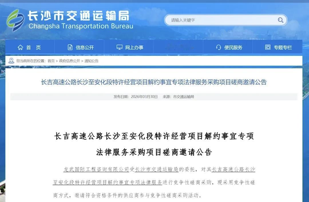 2026年4月10日,长沙市交通运输局官网发布《长吉高速、南横高速特许经营项目投资人招标代理单位竞争性磋商邀请公告》,正式启动长吉高速长沙至安化段项目投资人招标代理单位的采购工作。此时距离3月底项目启动解约专项法律服务采购仅过去十余天,标志着这条备受关注的省级重大交通工程,在推进特许经营协议解约程序的同时,快速迈入重新招标的前置准备阶段,彰显了长沙市推进项目落地的坚定决心与高效执行力。