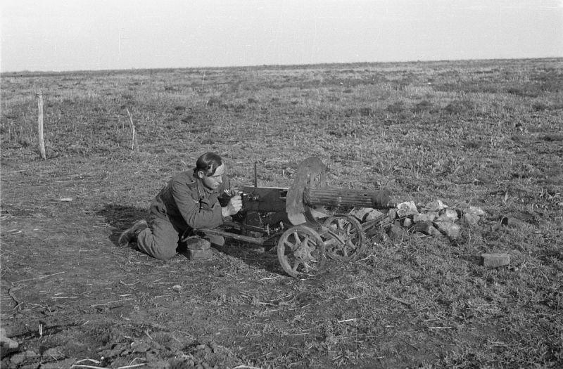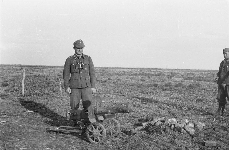 照片拍摄于1943 年库尔斯克地区,一名德军士官正站在一挺被遗弃的苏联马克沁 1910/30 式重机枪旁摆拍。这挺经典的水冷重机枪,水冷护套被弹片击穿,已经彻底无法使用,被苏军仓促遗弃。马克沁 1910/30 是二战苏军主力重机枪,在二战中被大量使用。